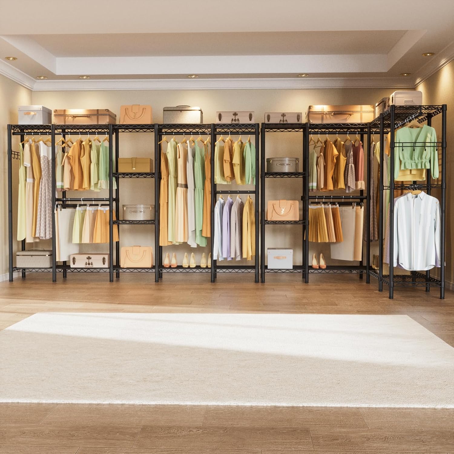 • Versatile Storage Solution: Elevate your organization game with Golpart's 5 Tiers Extra Large Garment Rack. Featuring 8 height-adjustable shelves and 4 detachable hanging bars, this multifunctional closet rack offers a variety of storage options for clothes, accessories, and shoes. Customize your space effortlessly to accommodate garments of different lengths and sizes