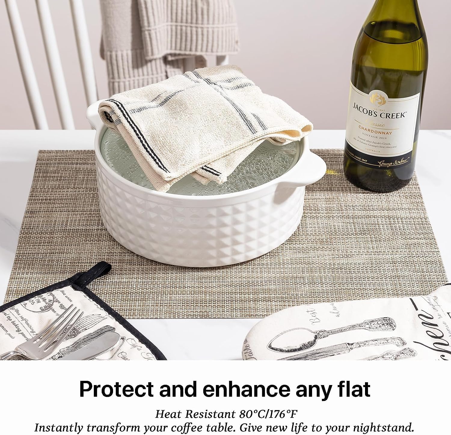 • EASY TO CLEAN:The washable placemats can be washed repeatedly.How to clean the place mats for kitchen table:Simply wipe with soap,water and a soft sponge or cloth.Scrub stubborn stains with a soft bristle-brush and a bleach-based cleanse.