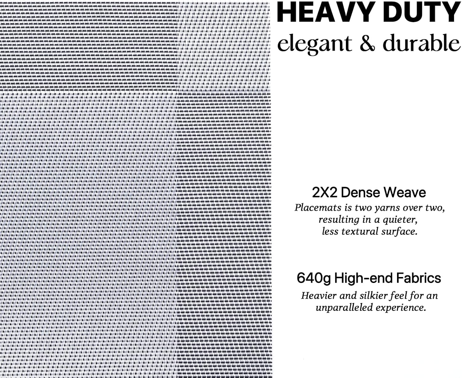 • HEAVY-DUTY:We uses the German-imported higher grammage vinyl material (Specialty PVC)than other placemats on the market,plus the precise,dense weave craftsmanship to give the woven placemats a thicker feel and make the place mats long-lasting.