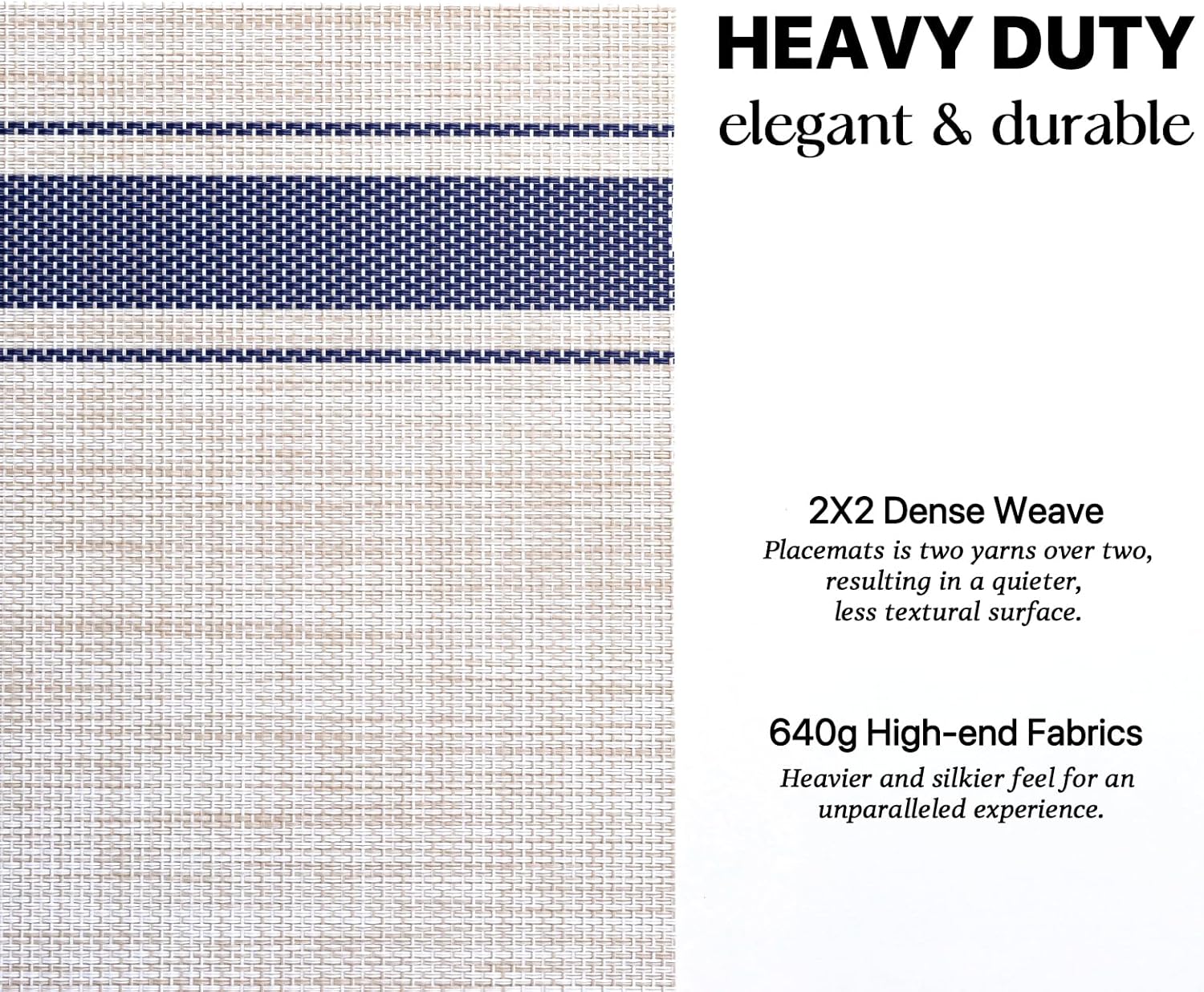 • HEAVY-DUTY:We uses the German-imported higher grammage vinyl material (Specialty PVC)than other placemats on the market,plus the precise,dense weave craftsmanship to give the woven placemats a thicker feel and make the place mats long-lasting.