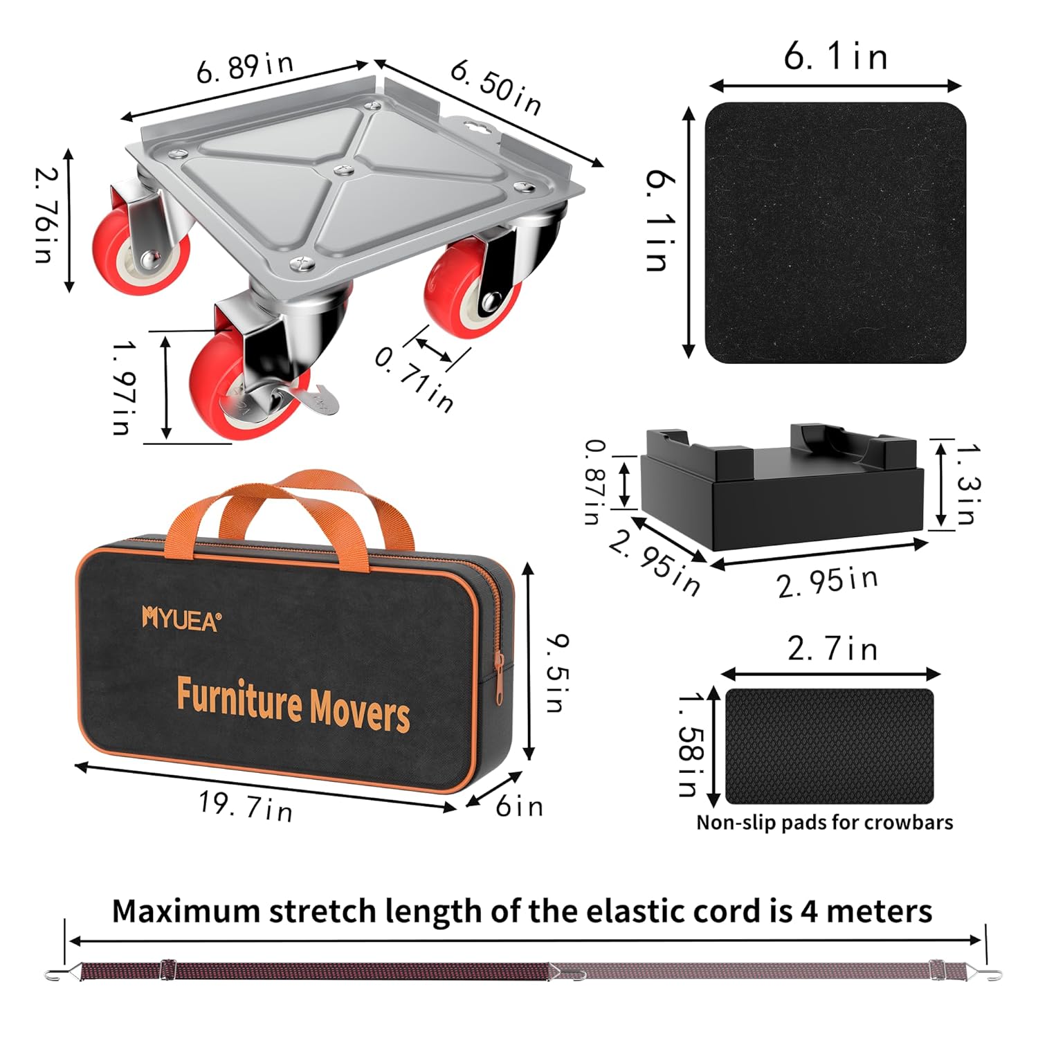 • [SURPRISE GIFT PACKAGE]:Upgraded large panel furniture dollies set, including four 6.5 x 6.5 in moving dolly,1 x pry bar,4 x heightening spacers,4 x flannel non-slip mats,2 x rubber anti-slip mats,1 x pair of safety gloves,1 x Canvas Tote Bag,1 x elastic cord.