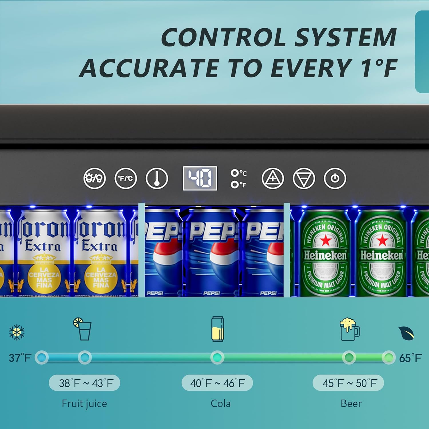 • Large Capacity & Mobile Shelf - This beverage refrigerator provides beverage enthusiasts with more spacious storage for up to 180 standard-sized cans. The beverage cooler includes 3 pull-out shelves that can be adjusted at will to space each tier on 5 fixed slots. The under counter refrigerator is equipped with a highly sensitive sensor that is adjustable from 37-65°F, and the temperature range will not exceed 3.6°F, so the drinks are at their best whenever you serve them