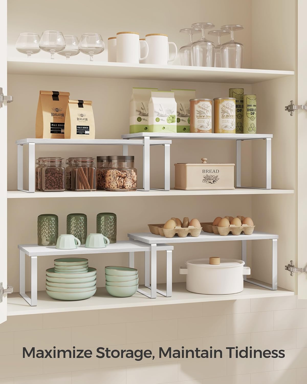 SONGMICS Cabinet Organizer Shelf, Set of 2 Kitchen Counter Shelves, Kitchen Storage, Spice Rack, Stackable, Expandable, Metal and Engineered Wood, Cloud White and Snow White UKCS025W01