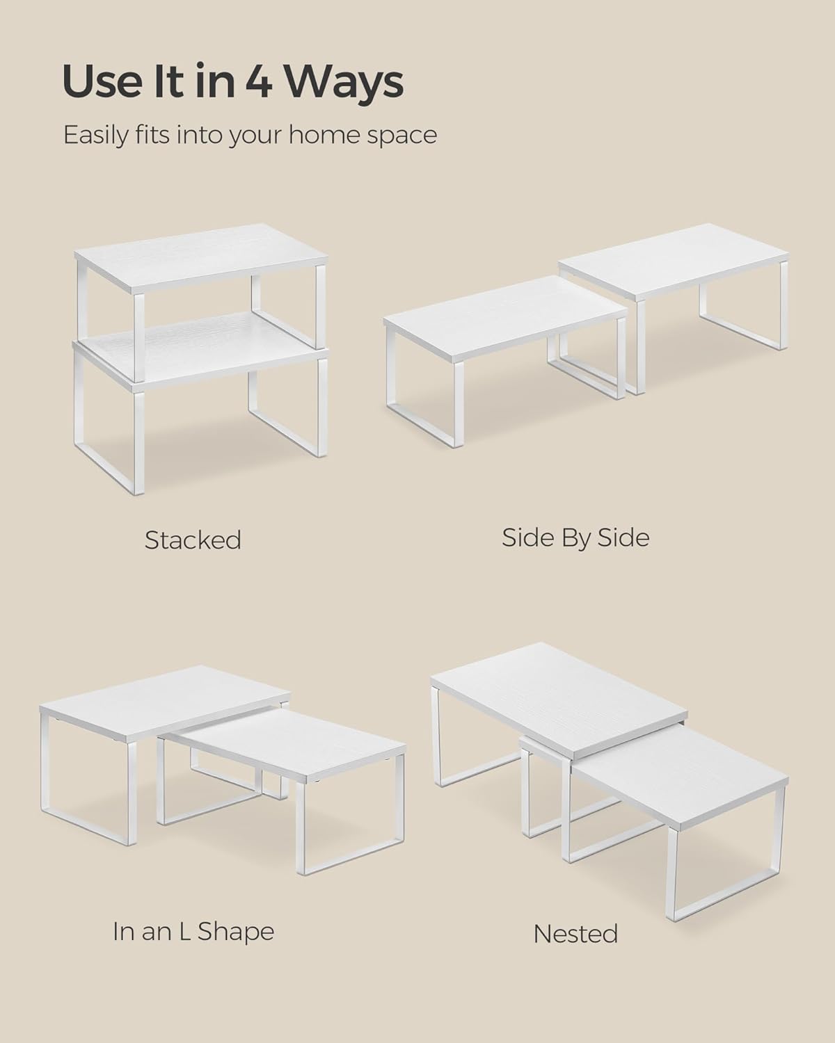 SONGMICS Cabinet Organizer Shelf, Set of 2 Kitchen Counter Shelves, Kitchen Storage, Spice Rack, Stackable, Expandable, Metal and Engineered Wood, Cloud White and Snow White UKCS02W01