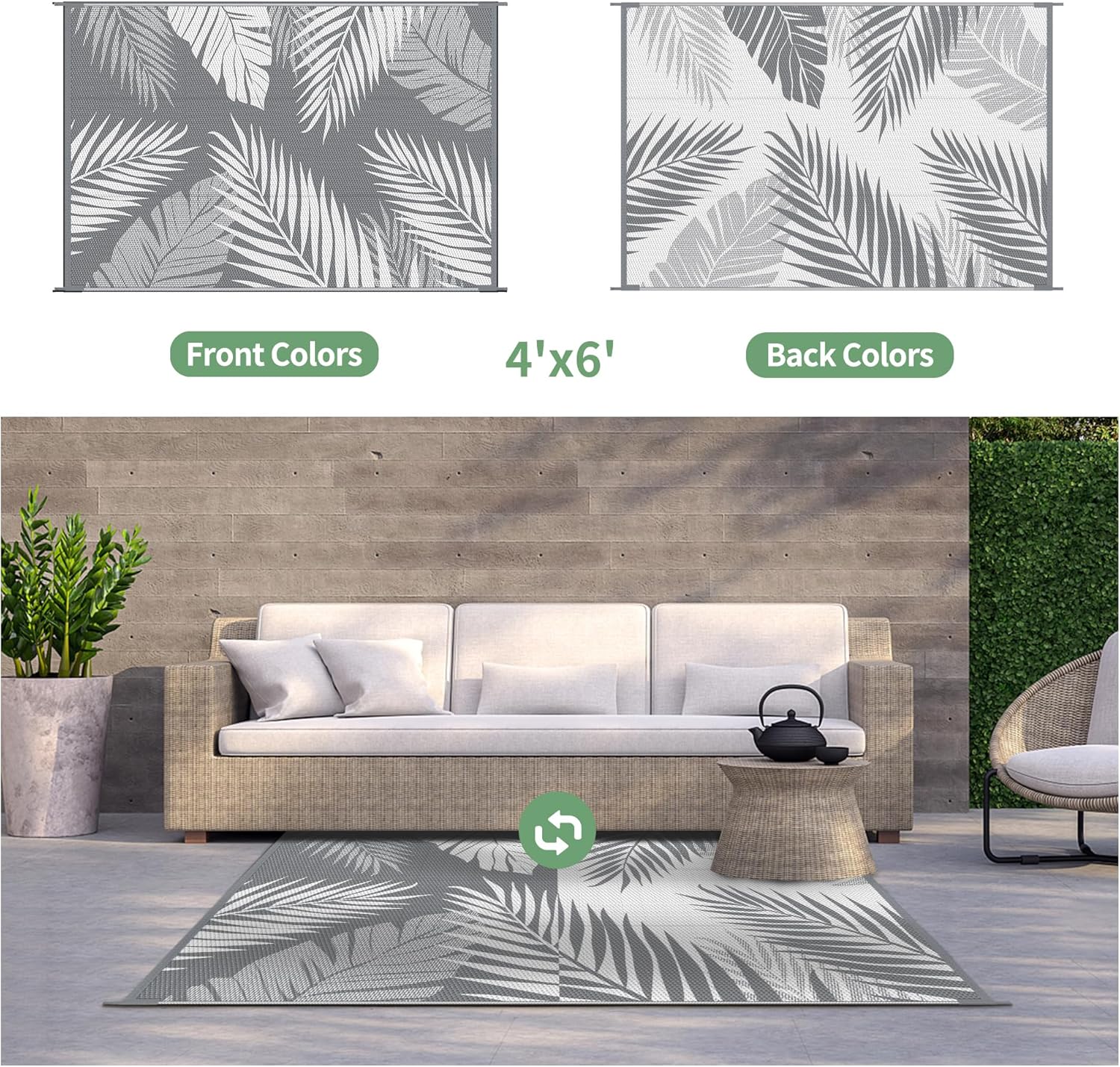 • Palm Leaf Design & Double-Sided Pattern: GENIMO reversible fall outdoor rug is designed with a double-sided pattern, completing the unique layout of multiple palm leaves. The 2 shades of grey and white achieve the ultimate fusion. Either side can blend perfectly with nature and look very full and comfortable, making it a versatile piece for fall decor