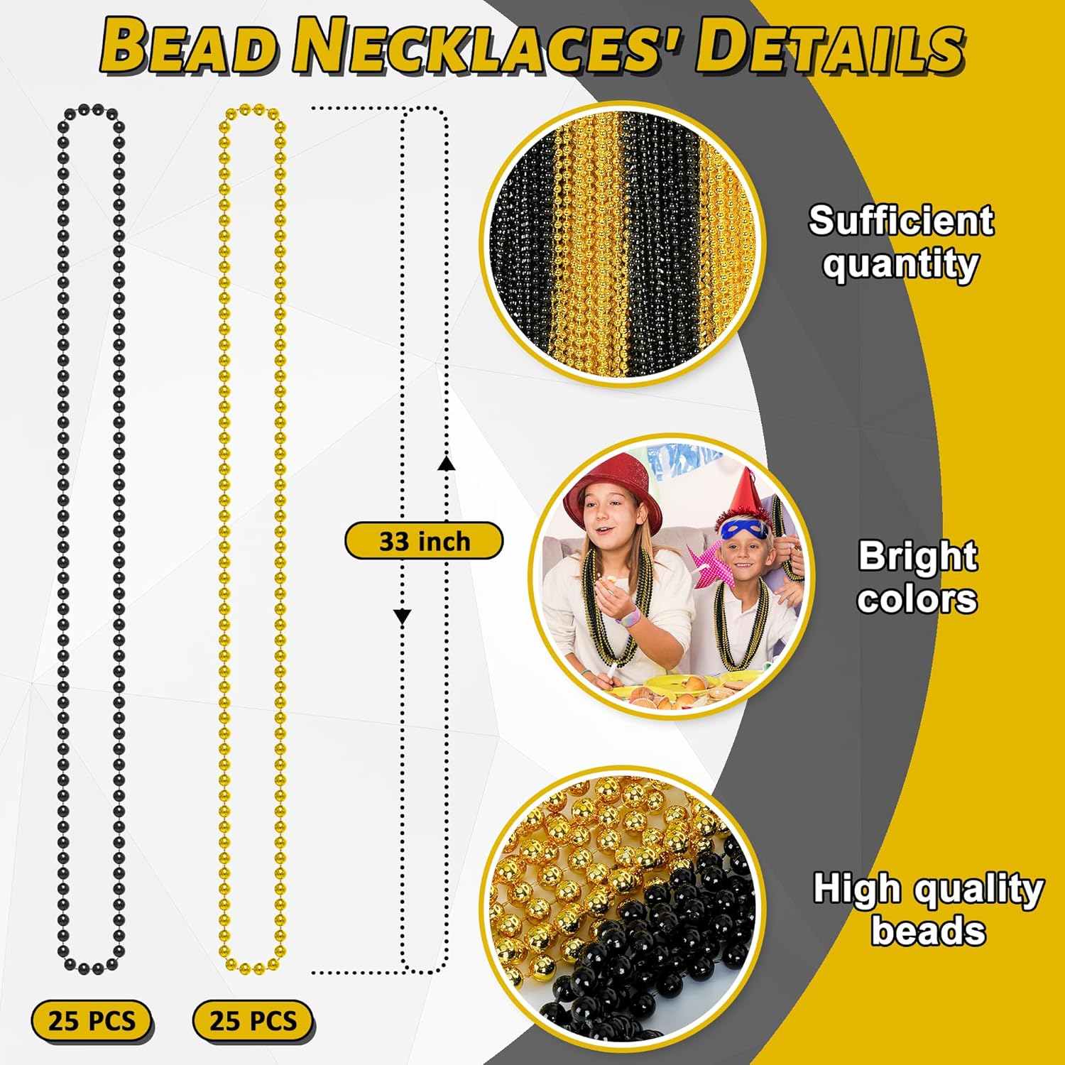 50PCS New Years Eve Bead Party Supplies, Black Gold Bead Necklace, 33" New Years Eve Beaded Necklaces, Festival Mardi Gras Parade Throw Accessories for Halloween Trick or Treat Accessories