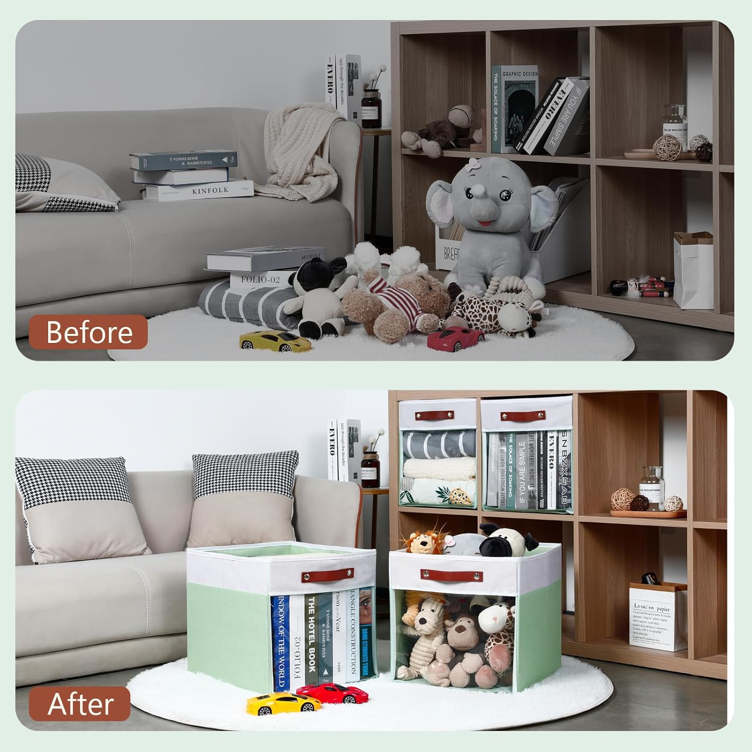 HNZIGE 13x15x13 Cube Storage Bins, 4 Pack Fabric Clear Organizer With Window, Large Collapsible Shelf Bins for Closet, Toy, Clothes - White Green
