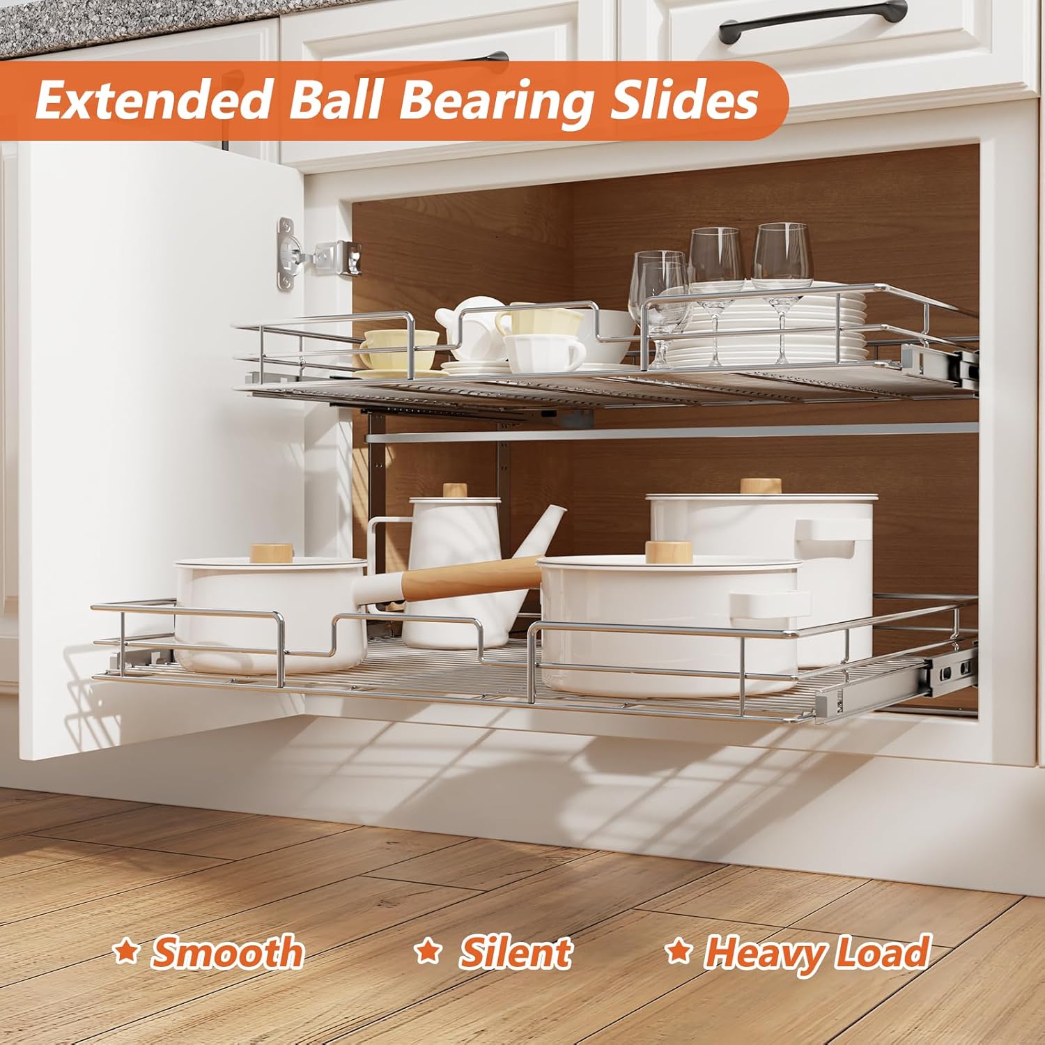 ROOMTEC Individual Pull Out Cabinet Organizer (25½"W x 21½"D), 2 Tier Spice Rack Organizer for Cabinet, Slide Out Drawer Pantry Shelf Organization and Storage for Kitchen Bathroom