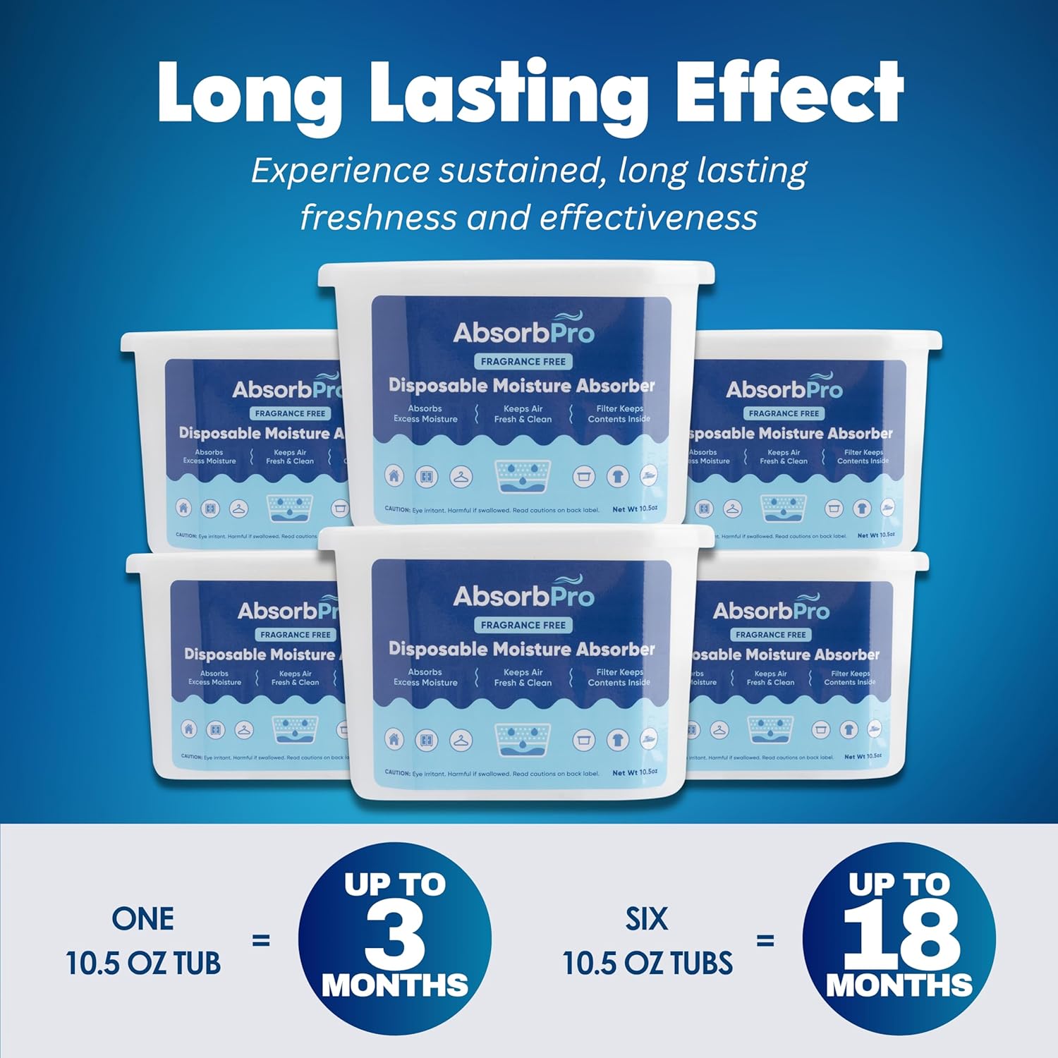 Moisture Absorber Tub Fragrance Free - 6-Pack - 10.5 oz Unscented Disposable Odor Eliminator Box & Dehumidifier for Garage, Home, Kitchen, Bedroom, Bathroom, Closet, Cars, and Boats