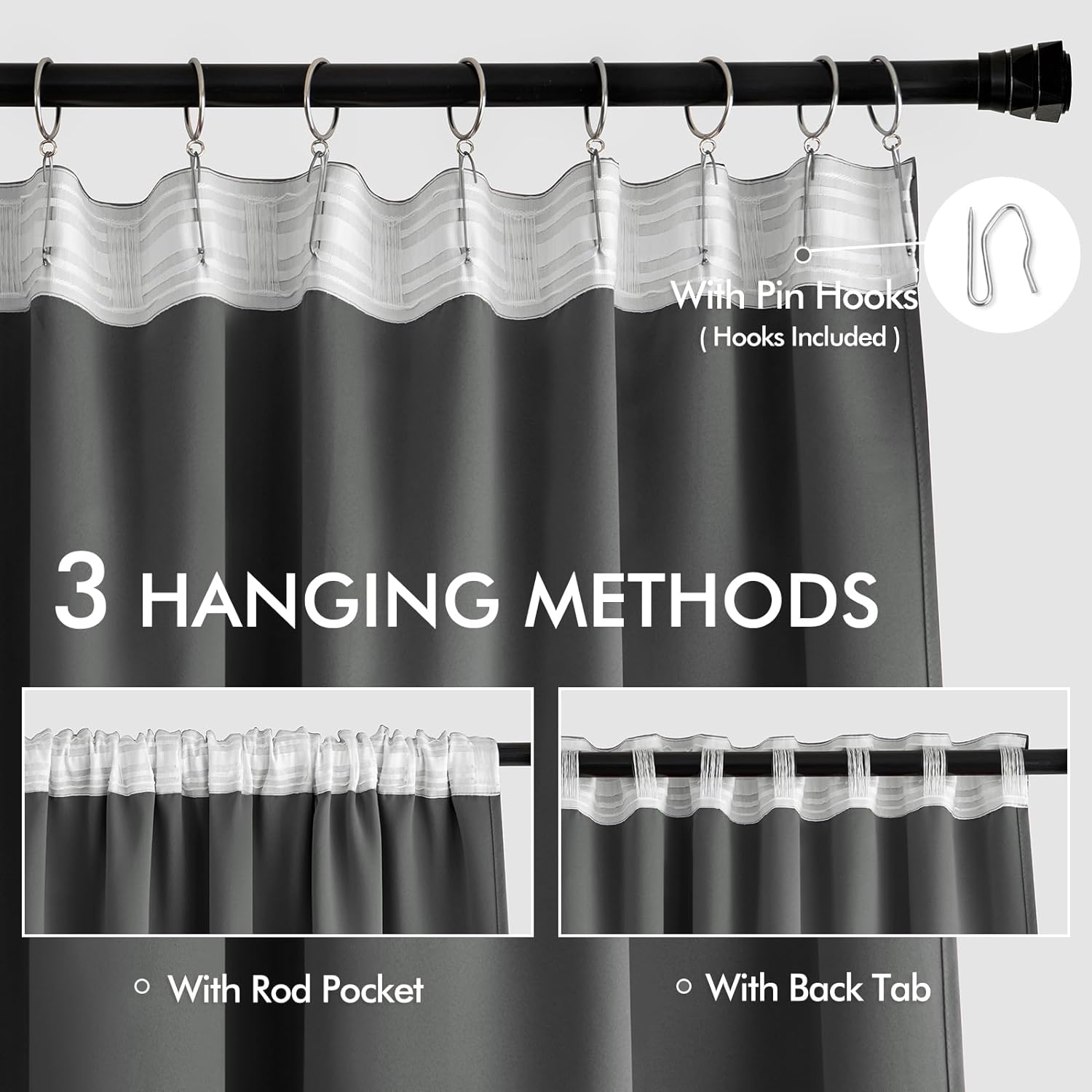 • MULTIPLE HANGING OPTIONS: Each panel features a 3-in-1 top style design: Rod Pocket, Back Tab and Pinch Pleat. The Back loop (2.3 "long) and rod pocket (3.1" long) fit most standard rods. Curtains also can be hung with clip rings or different type of hooks. We will GIVE AWAY 20 PIN HOOKS for each pair of curtains for your convenience (rings won't be included). PLEASE NOTE THAT FOR THE PLEAT HANGING METHOD, VISIBLE PLEATS CAN ONLY BE ACHIEVED BY USING 4 PRONG HOOKS, AND WE ONLY PROVIDE PIN HOOKS.