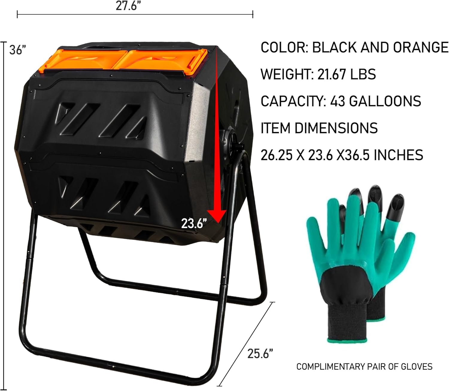 • 43 Gal Dual Chamber Composter: This 43 gallons composter with dimensions of 27.6 × 25.8 × 36 inch. This large tumbling composter makes recycling kitchen scraps a breeze.