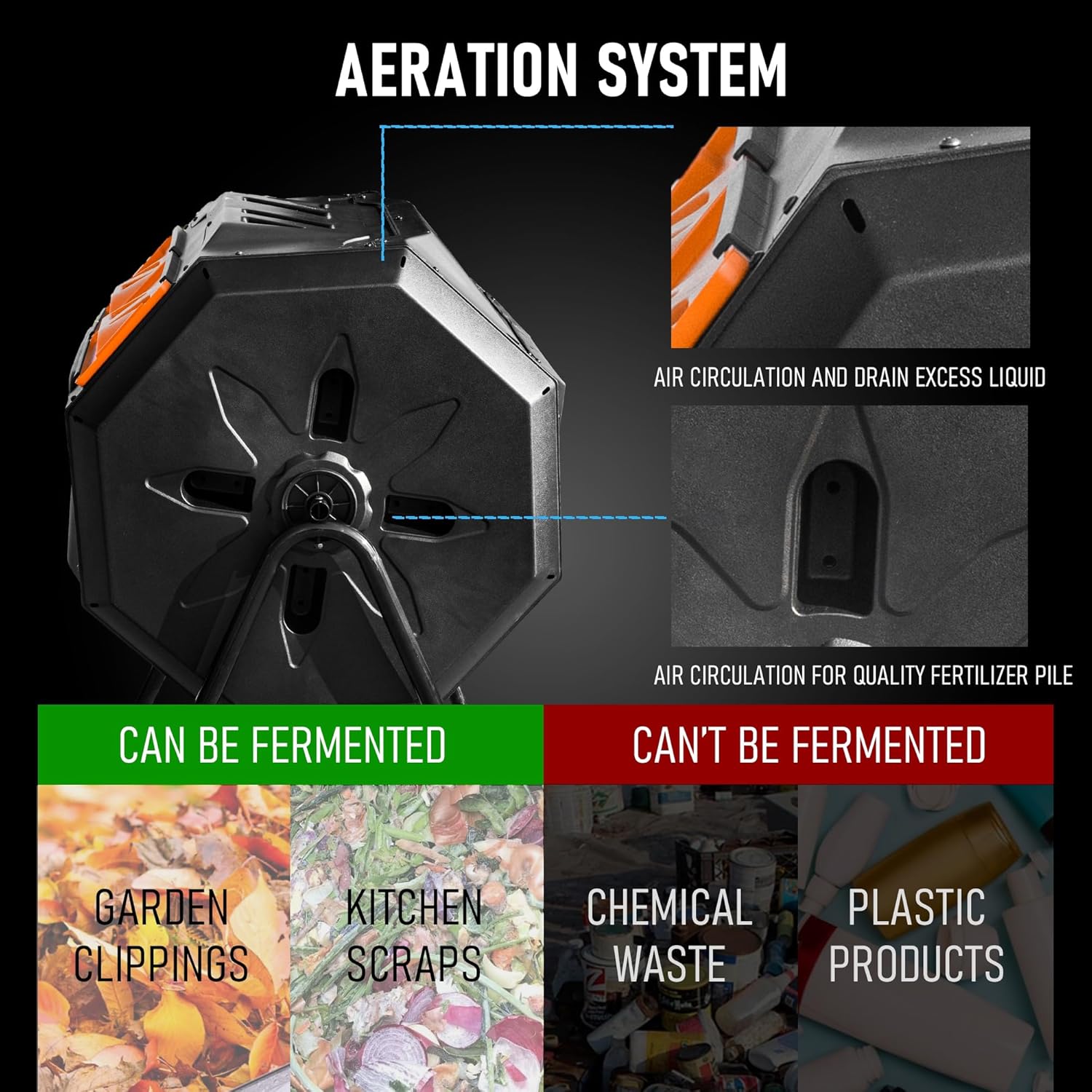 • 360° Tumbling Design: Gone are the days of manually stirring and digging into your compost pile. Deep flaps on panels and in deep grooves combine to smoothly rotate the compost bin and promote the compost process. The large openings and removable door ease the addition of scraps or clippings and the removal of completed compost.