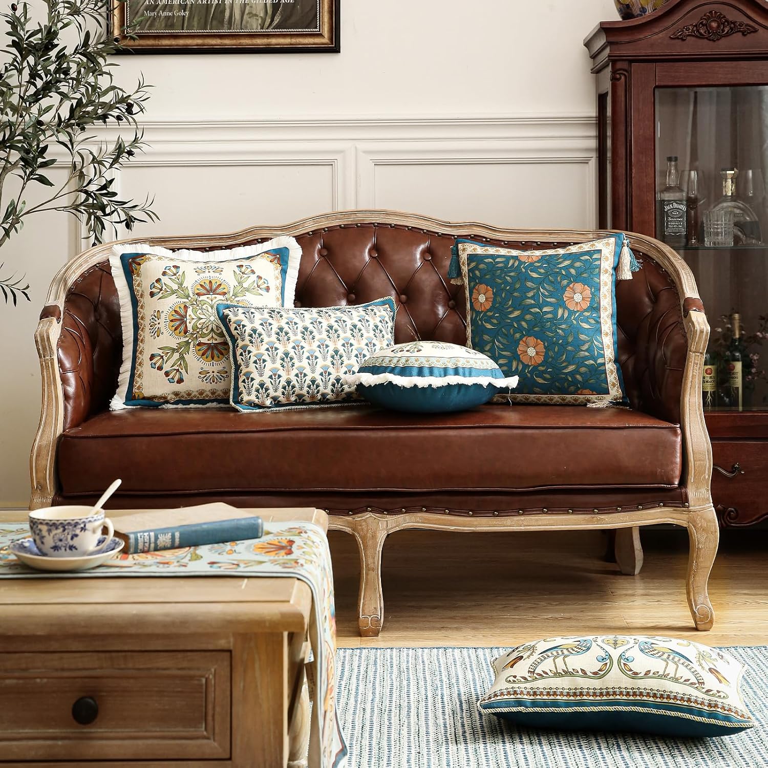 patdrea Designer Throw Pillow Covers Set of 4,French Vintage Blue Linen with Floral Collection Pattern Pillow Cover,Decorative Rectangle and Square Pillowcases Cushion for Bed Living Room Outdoor