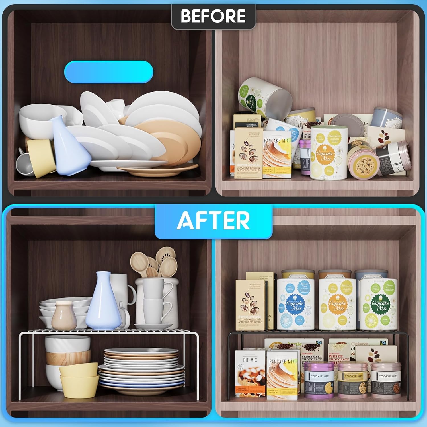 • Space Saver Help Shelves: This set of 4 helper shelves will double your space! Perfect for keeping everything organized in kitchen cupboards, pantries, bathroom cabinets, closets, counter tops, under the sink, or anywhere you need extra room