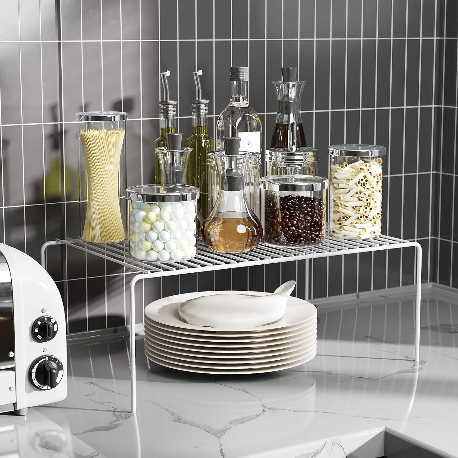 • Perfect Size: Each wire shelf measures 13''L x 9.4''W x 5.5''H. Perfect size makes this cabinet shelf rack perfect for you to organize your kitchen supplies, you can easily organize your jars, pots, pans and spices etc