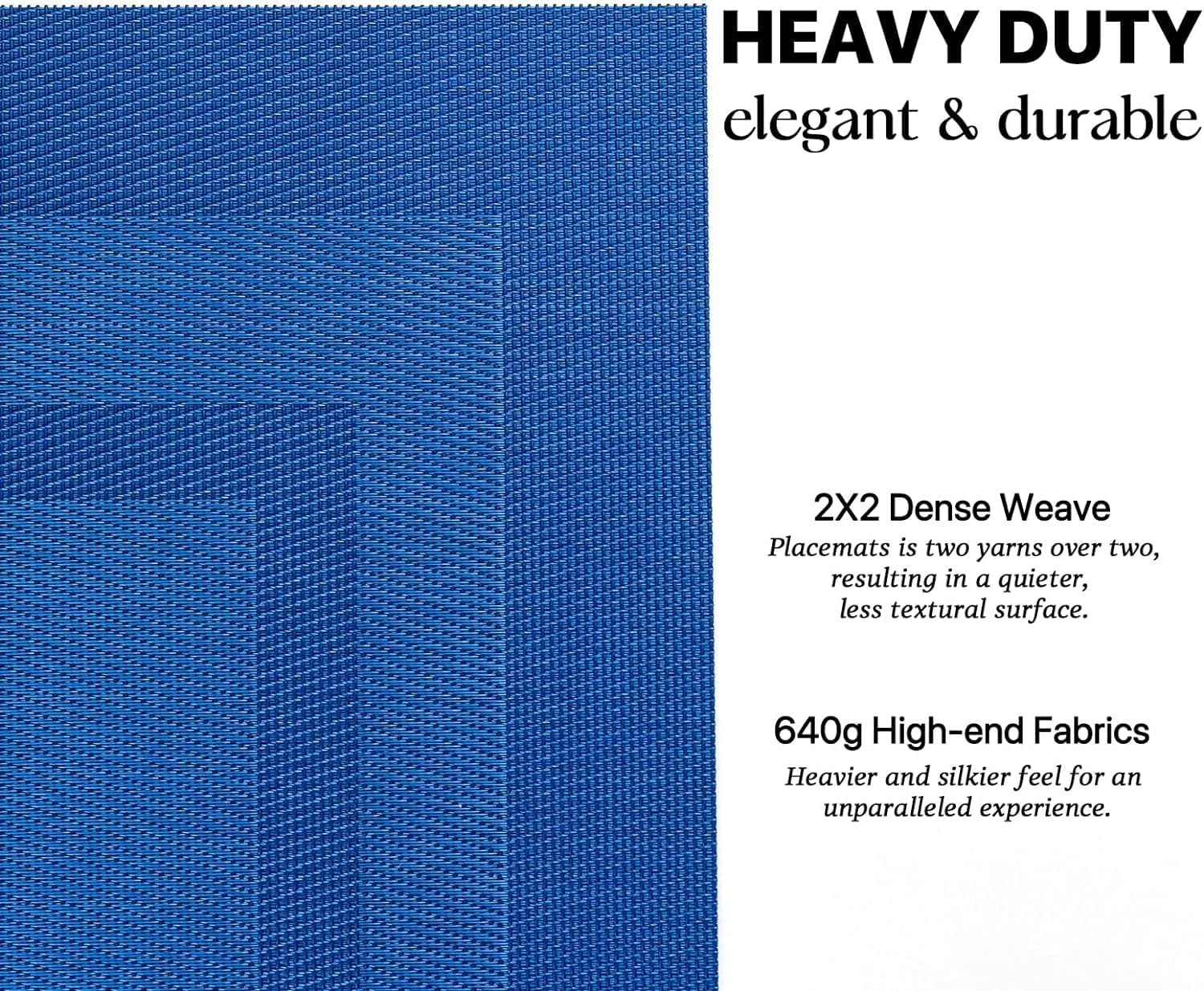 • HEAVY-DUTY:We uses the German-imported higher grammage vinyl material (Specialty PVC)than other placemats on the market,plus the precise,dense weave craftsmanship to give the woven placemats a thicker feel and make the place mats long-lasting.