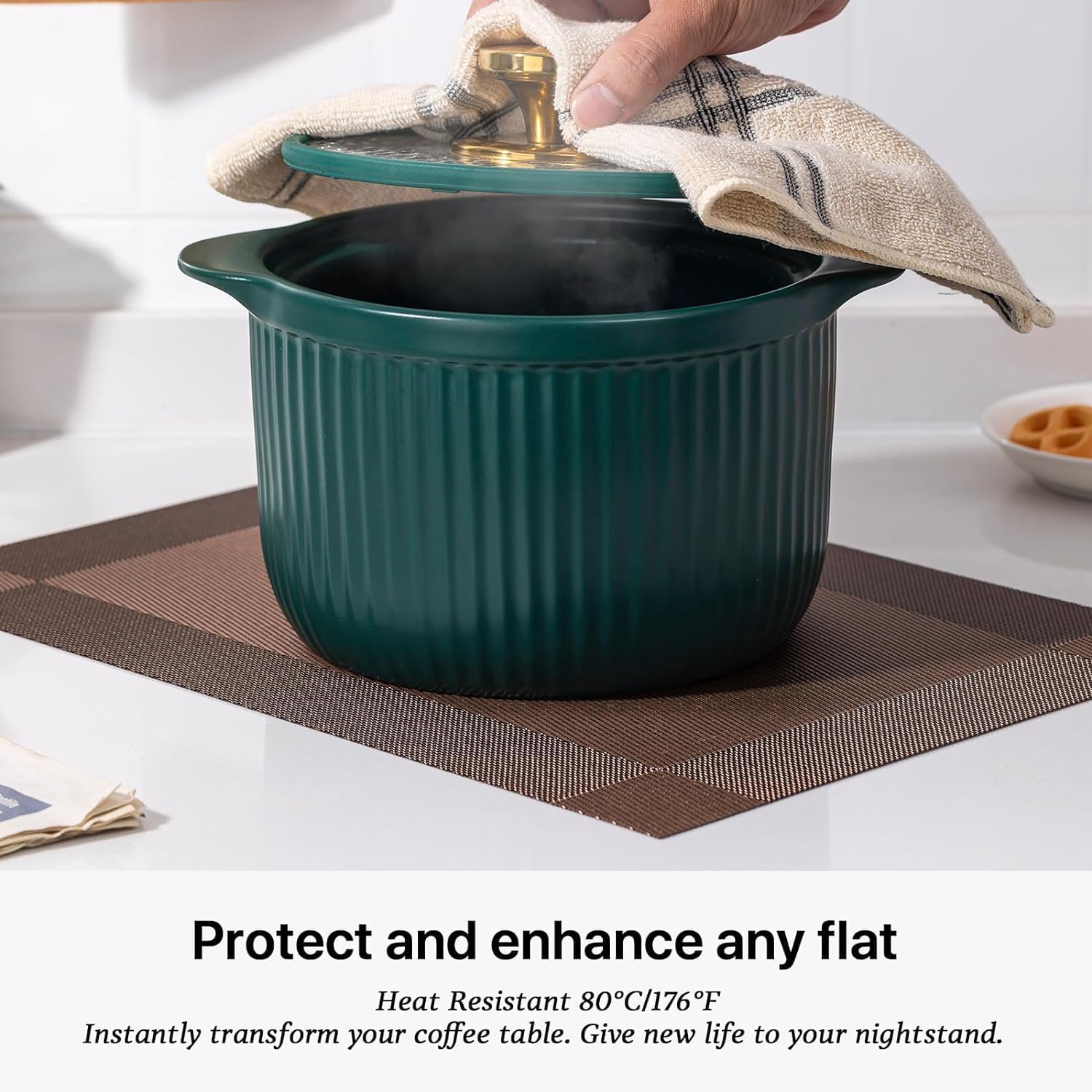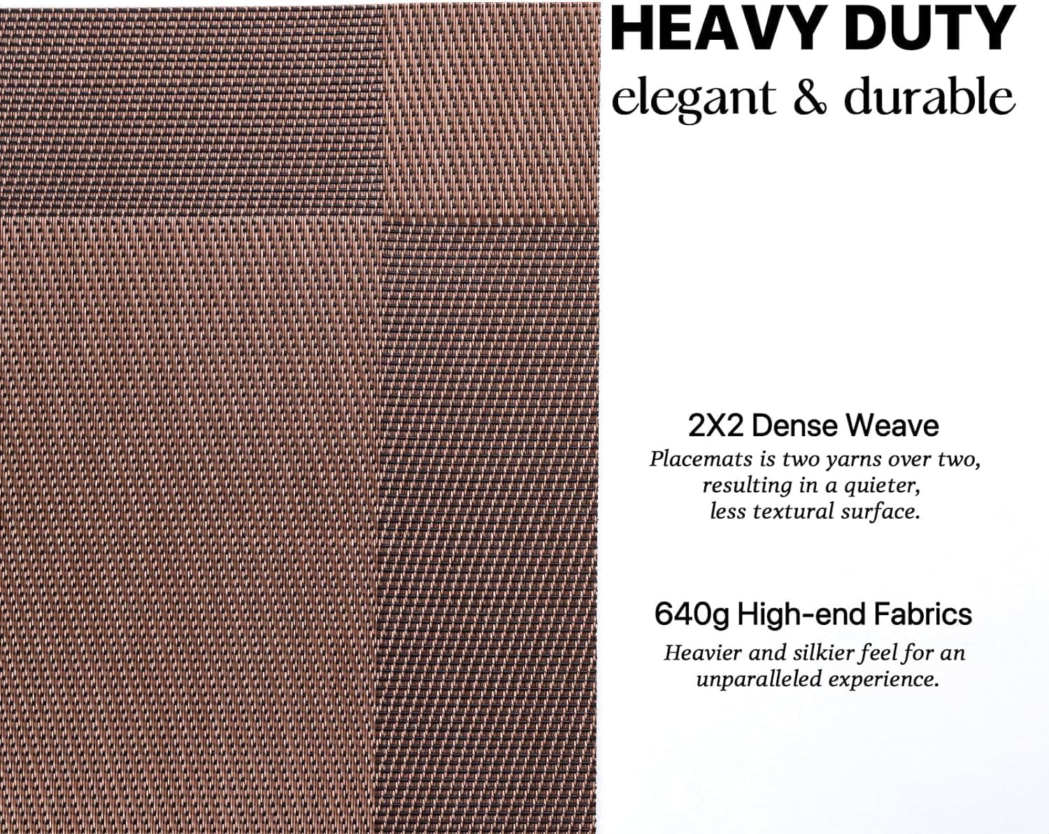 • HEAVY-DUTY:We uses the German-imported higher grammage vinyl material (Specialty PVC)than other placemats on the market,plus the precise,dense weave craftsmanship to give the woven placemats a thicker feel and make the place mats long-lasting.