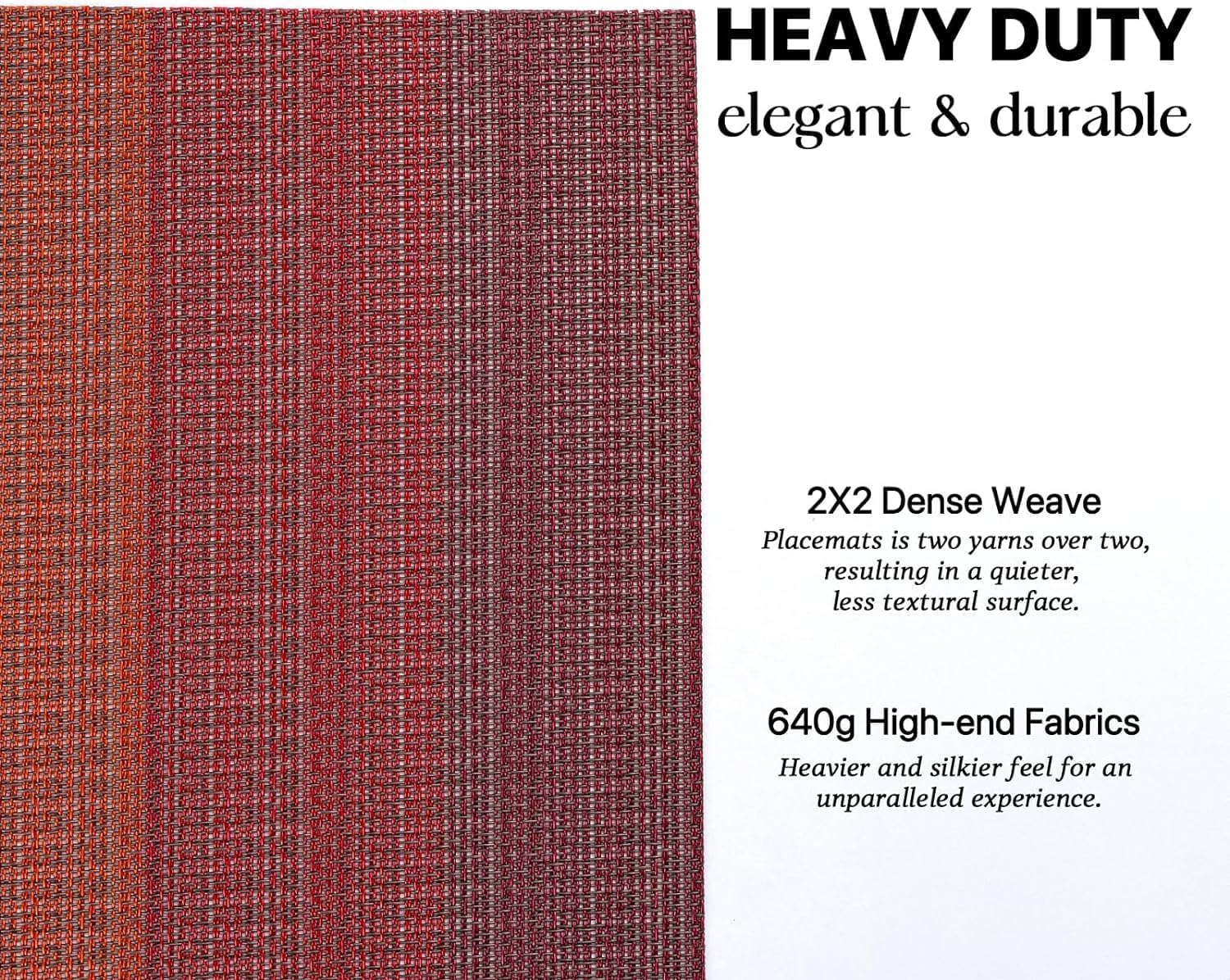 • HEAVY-DUTY:We uses the German-imported higher grammage vinyl material (Specialty PVC)than other placemats on the market,plus the precise,dense weave craftsmanship to give the woven placemats a thicker feel and make the place mats long-lasting.
