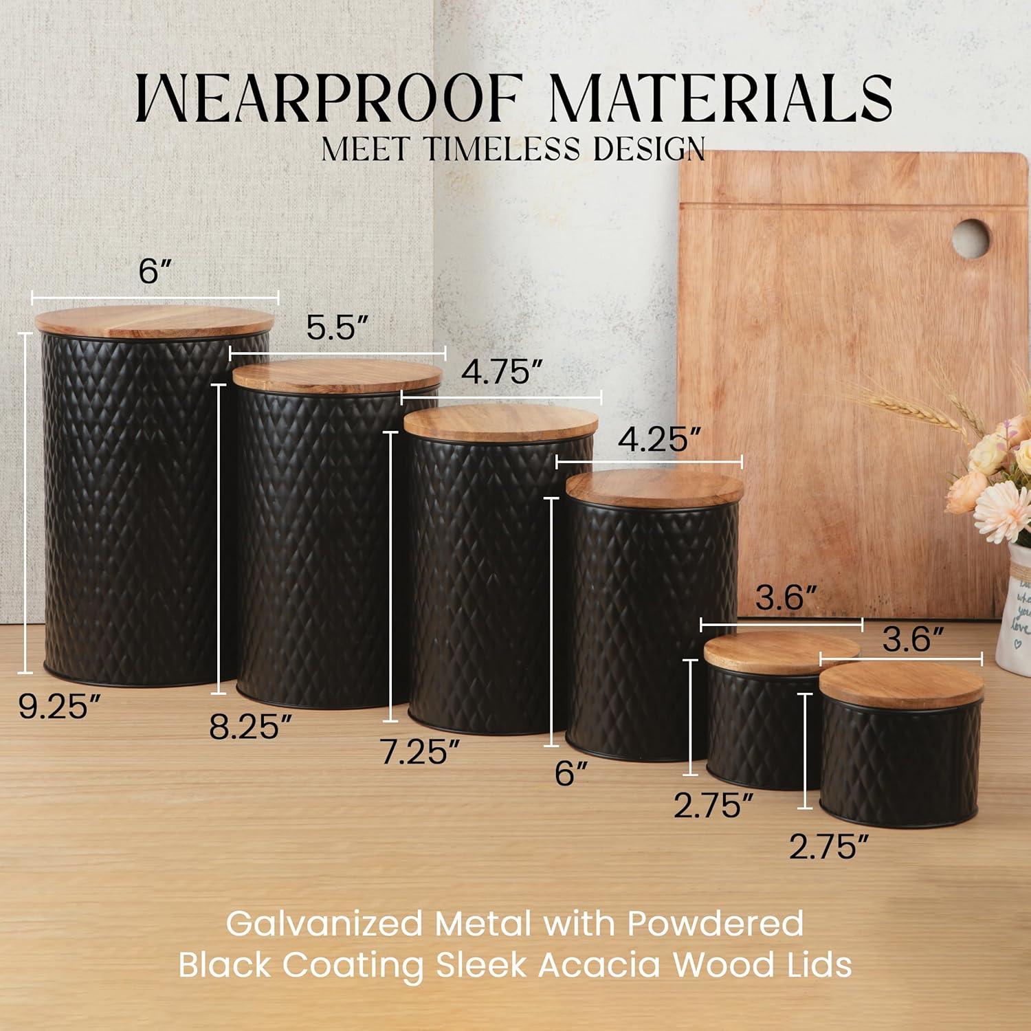 6 Canister Set for the Kitchen Countertop – Metal Food Storage Canisters with Airtight Lids for Flour, Tea, Crafts, Coffee, & Sugar – Container Set with Modern Wood Lids, Black