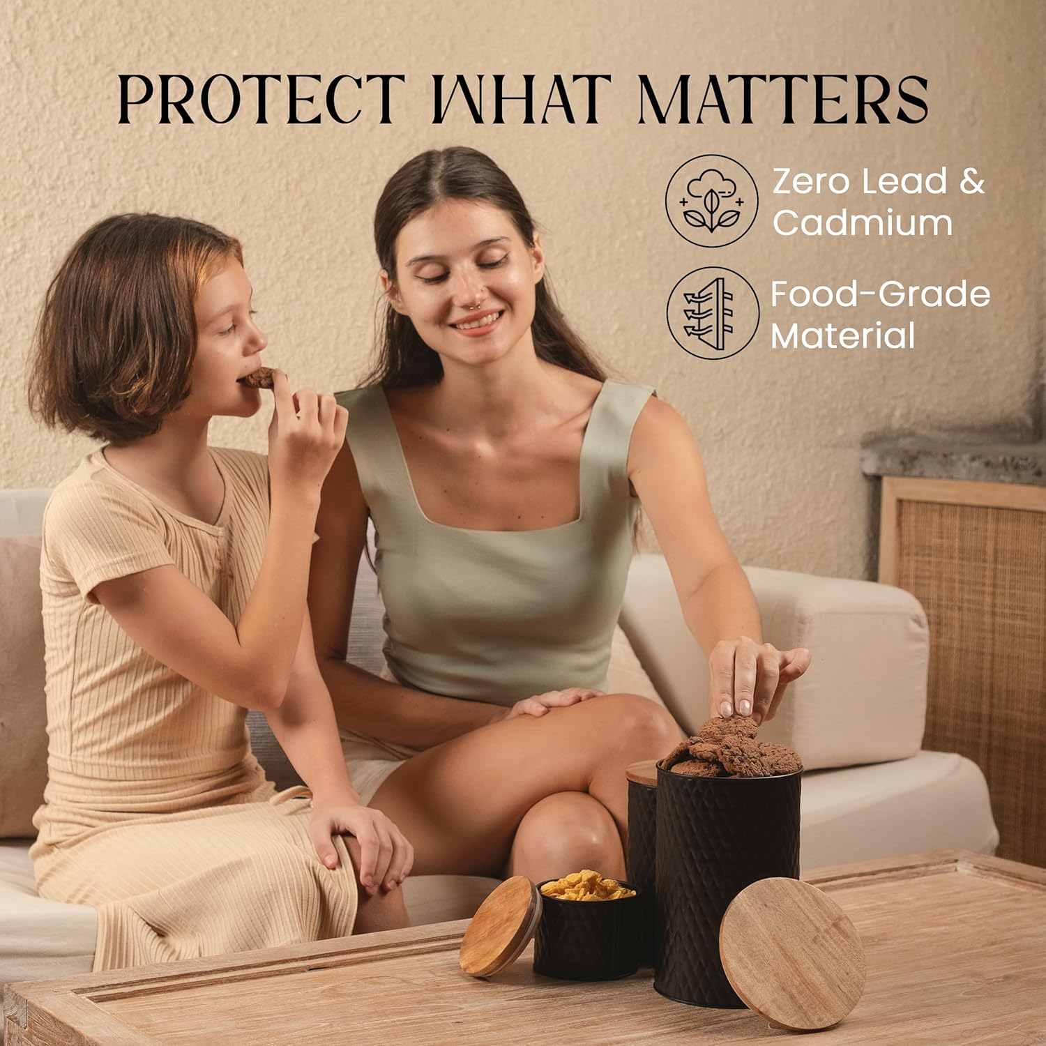 • Beauty Is in the Details – Elevate your style as you reduce stress. Your kitchen canister set delivers high-end quality with black galvanized metal and sleek acacia wood to complement any aesthetic.