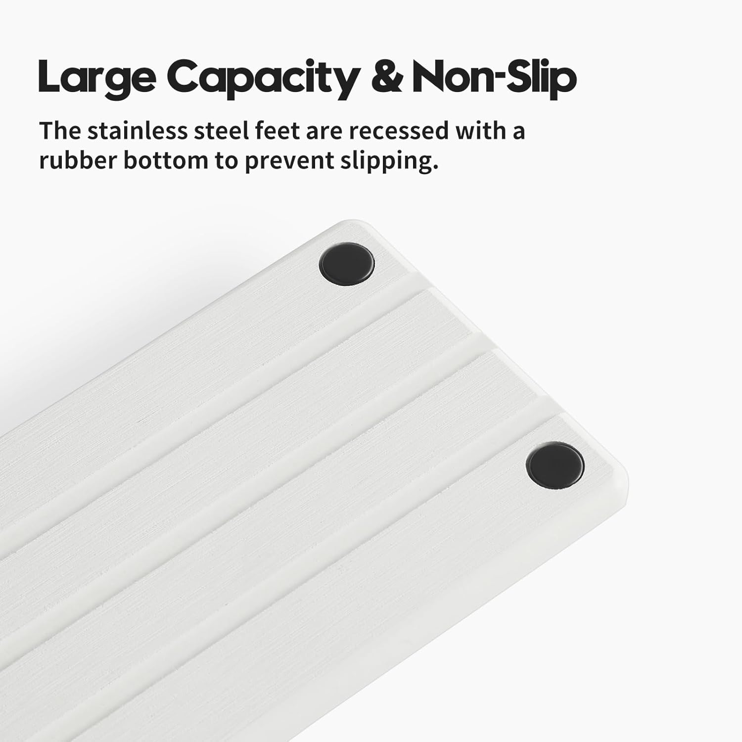 • 【Size and Capacity】10"L x 4"W x 1"H.This sink tray has a larger capacity due to the recessed feet. The 4 feet are made of high-grade stainless steel material with non-slip rubber, rust-proof. The color is not pure white, but closer to ivory.