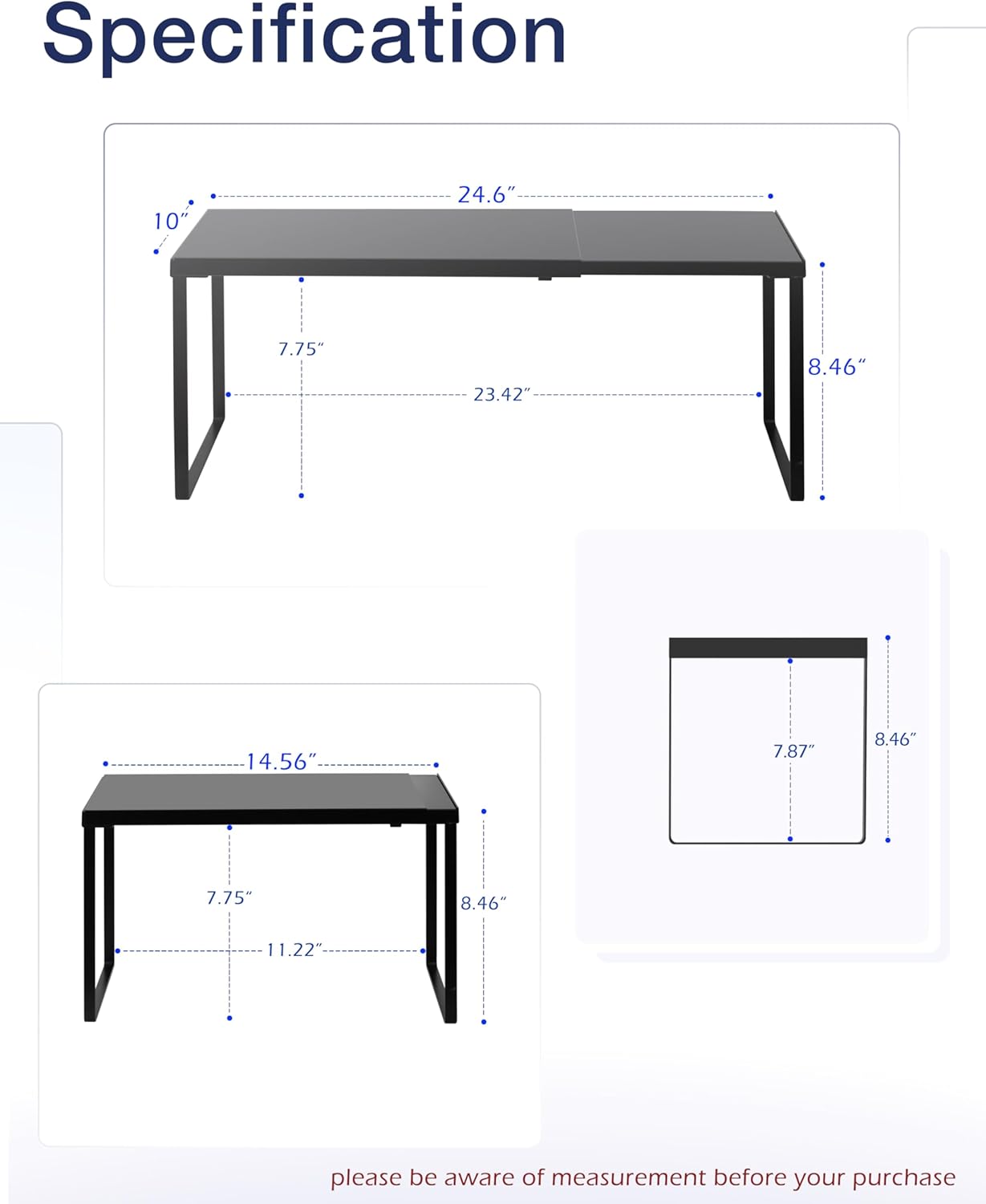 • SPECIFICATION: 10’’D * 14.56-24.6’’W * 8.46’’H. If you purchase 2 of these expandable shelves set you can stack one of top of another thereby creating a two-tier storage space. Easy to assemble with a clear manual.