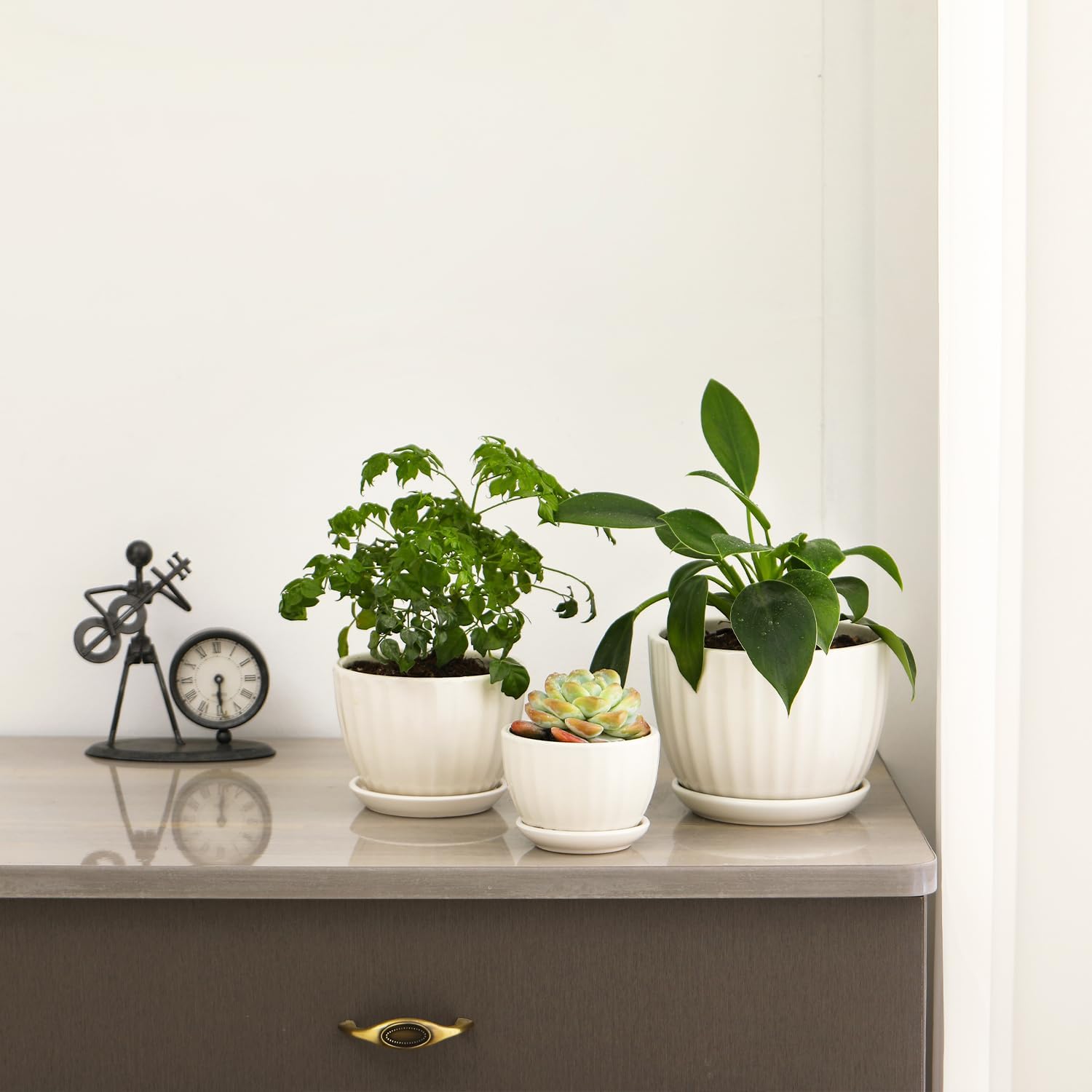 • SMALL PLANTER SET: These garden plant pots are made of ceramic and come in three sizes: Medium width is 5.5 inches (14 cm), Small width is 4.3 (11 cm) inches, and nimi width is 3.3 inches (9 cm). They are fired at high temperature, so they are durable and lightweight.