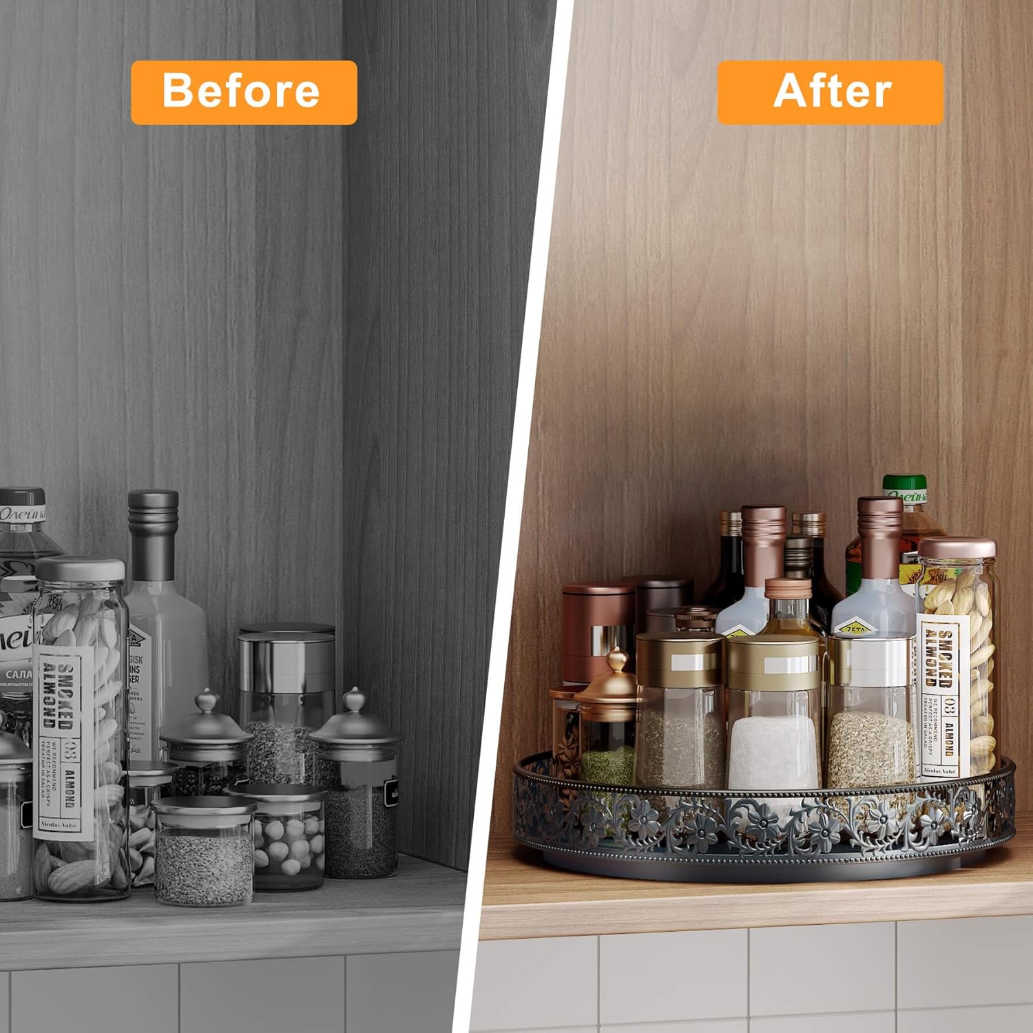 • 【Design with Floral Raised Edges and Open】The lazy susan for cabinet heightened edge with beautiful classic flower design not only provides exceptional decorative visual, but also prevents items from falling when rotating, it's safer to move the lazy susan organizer tray from one place to another.The open design of turntable organizer makes items clearly visible and easy to access and use.
