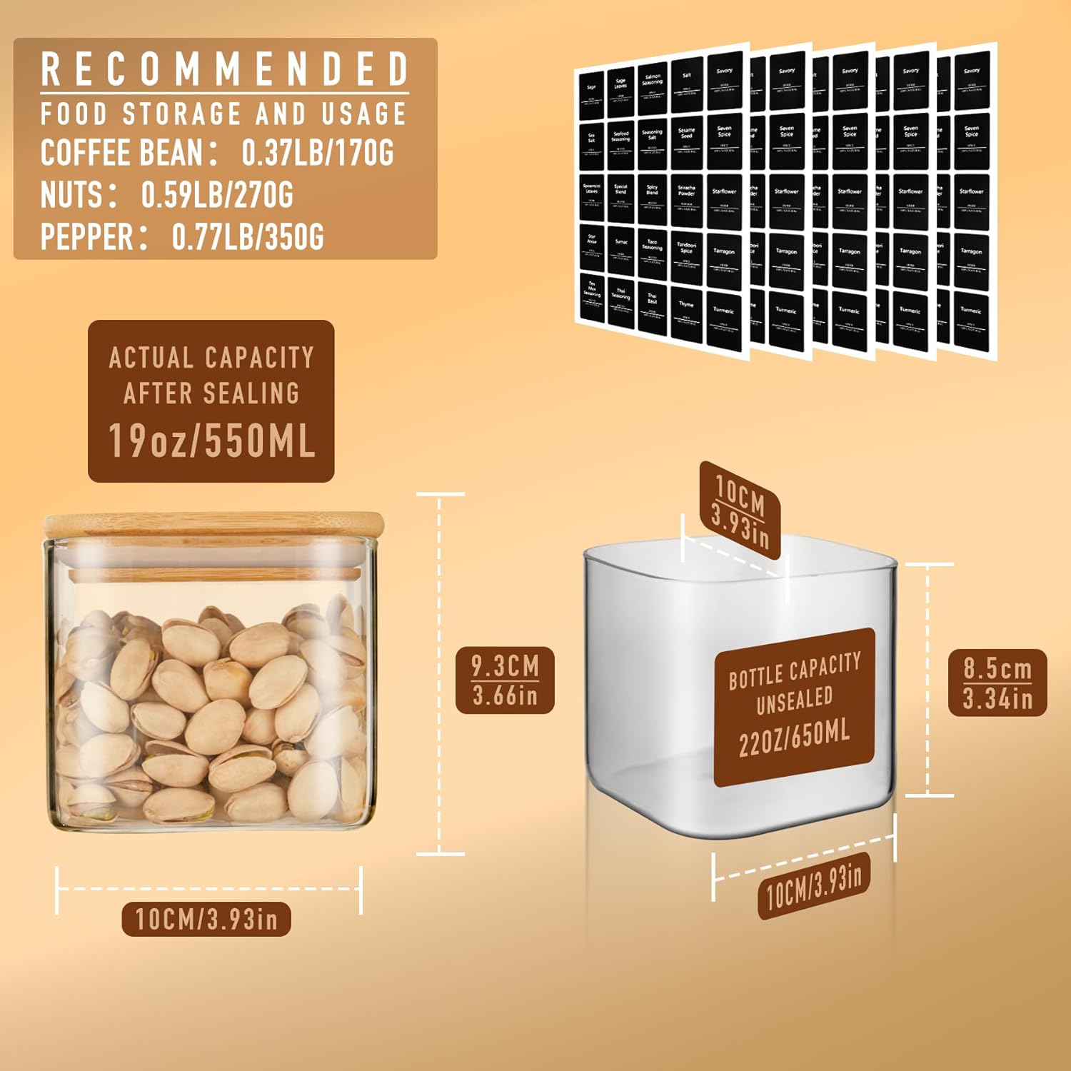 • [Extensive use] Our glass jars with bamboo lids are not only suitable for storing dry food such as beans, salt, sugar, spices and seasonings in the kitchen, but also for storing small items such as cotton balls, cotton pads and headbands in the bathroom or vanity.Contents: 6 storage jars with Black Lable. Size: Capacity is 22oz/650ml and dimensions are 10x10x9.3cm. Also included are oil and water resistant labels,