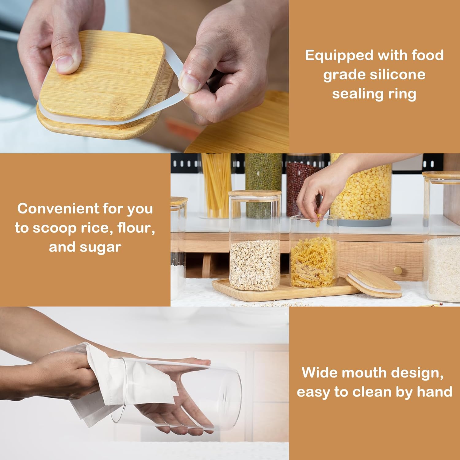 • [Transparent jar]- Transparent square glass containers make your items visible, allowing you to clearly see the contents of the glass storage jar and the remaining stock, and then you can easily replenish the food that is about to run out.