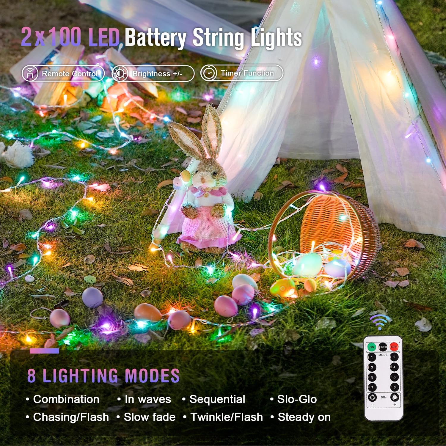 JMEXSUSS 2 Pack Easter Lights Battery Operated Outdoor Indoor, Total 66ft 200 LED Multicolor Easter String Lights for House Porch Yard Garden Tree Decorations