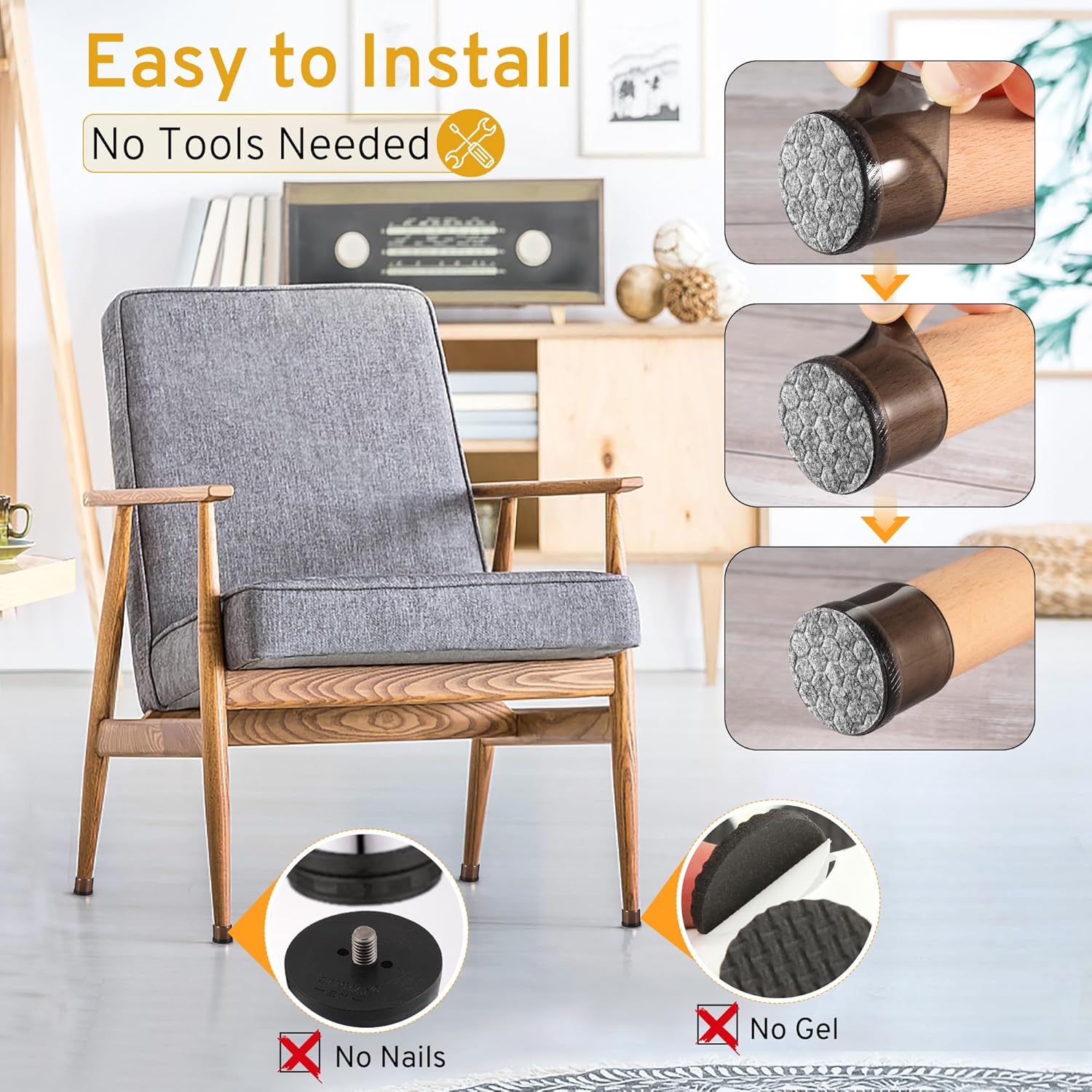 • ✅【Easy to Use】The furniture leg protectors are easy to install, without the use of tools. You just need to slip the chair leg protectors for hardwood floors over the bottoms of the chair legs. Easy to put on and take off. Much better than the felt or ones that have to be nailed on! Mainly suitable for smooth floors such as hardwood, tile, composite floor, and vinyl floor. Cap style match with most floors.
