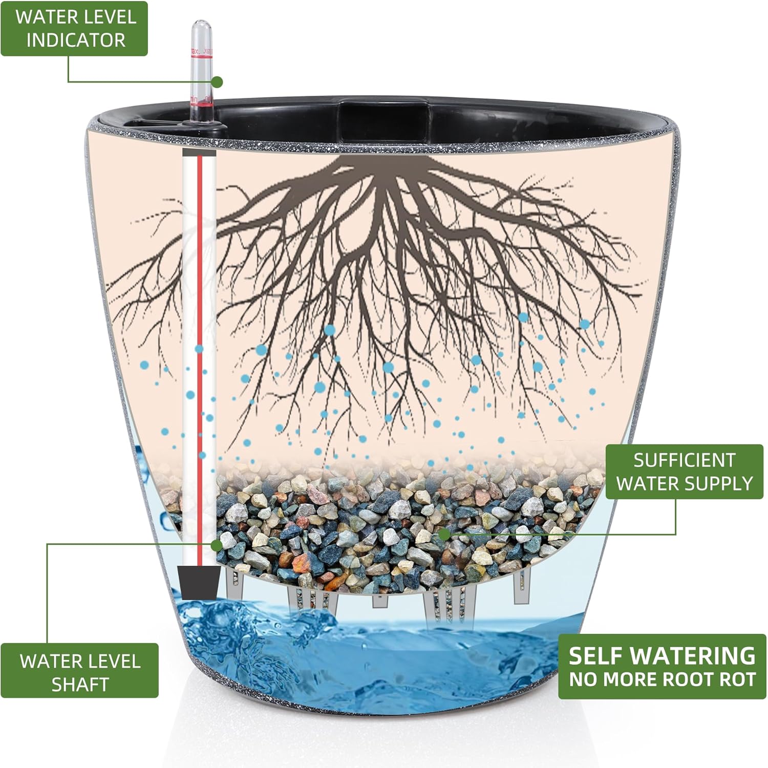 • NEVER MISS WATERING AGAIN - The hydroponic device keeps water ready, then watering time is at your discretion on the gauge. The design of drainage plug and spillway hole is to avoid cycles of overwatering and underwatering, pull out the plug to drain the excess water on rainy days outdoors. The sufficient water supply system enables double the water-efficient than conventional pots. Don't be anxious about missing watering while you enjoy a long term holiday on a journey or travel outside