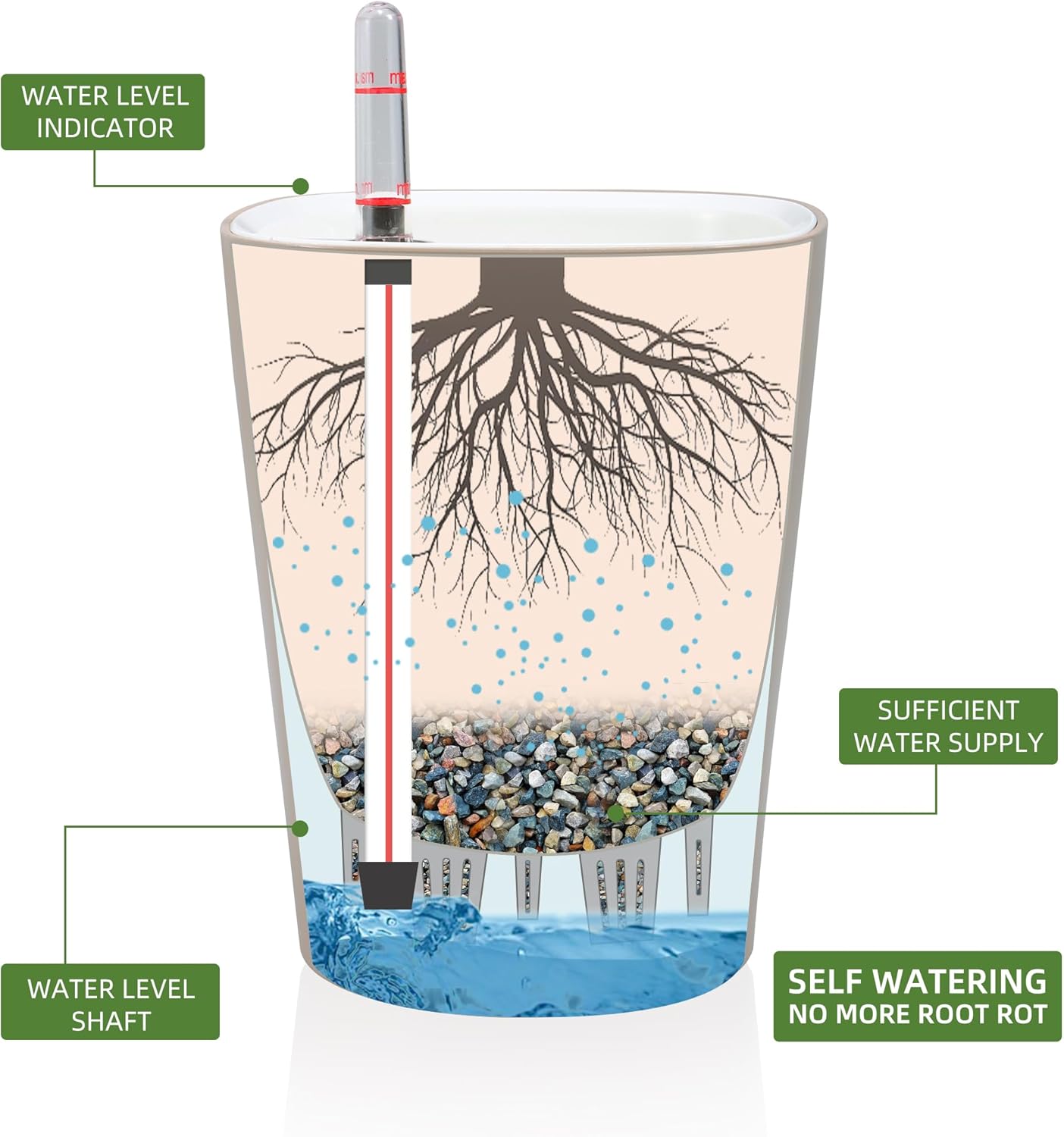 • SELF WATERING & NO MORE ROOT ROT - The smart unique sub-irrigation system is one of the most appealing aspects among all Dexceder planters. The easy-to-use separated integrated water reservoir or catcher- keeps your soil well aerated and automatic supplies plants with the right amount of ongoing moist air & nutrition for optimal growth. The insert indicator shows you the exact time to water again. The full water supply period can single-handedly last over 3 weeks based on different live plants