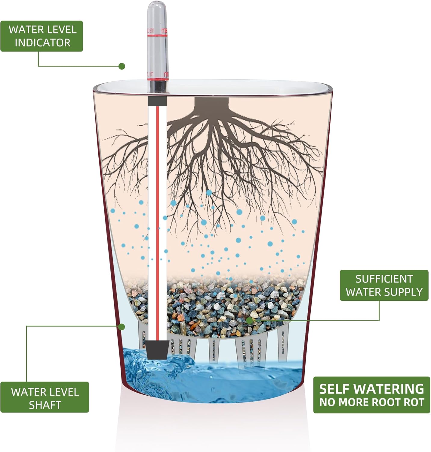 • NEVER MISS WATERING AGAIN - The hydroponic device keeps water ready, then watering time is at your discretion on the gauge. The design of drainage plug and spillway hole is to avoid cycles of overwatering and underwatering, pull out the plug to drain the excess water on rainy days outdoors. The sufficient water supply system enables double the water-efficient than conventional pots. Don't be anxious about missing watering while you enjoy a long term holiday on a journey or travel outside