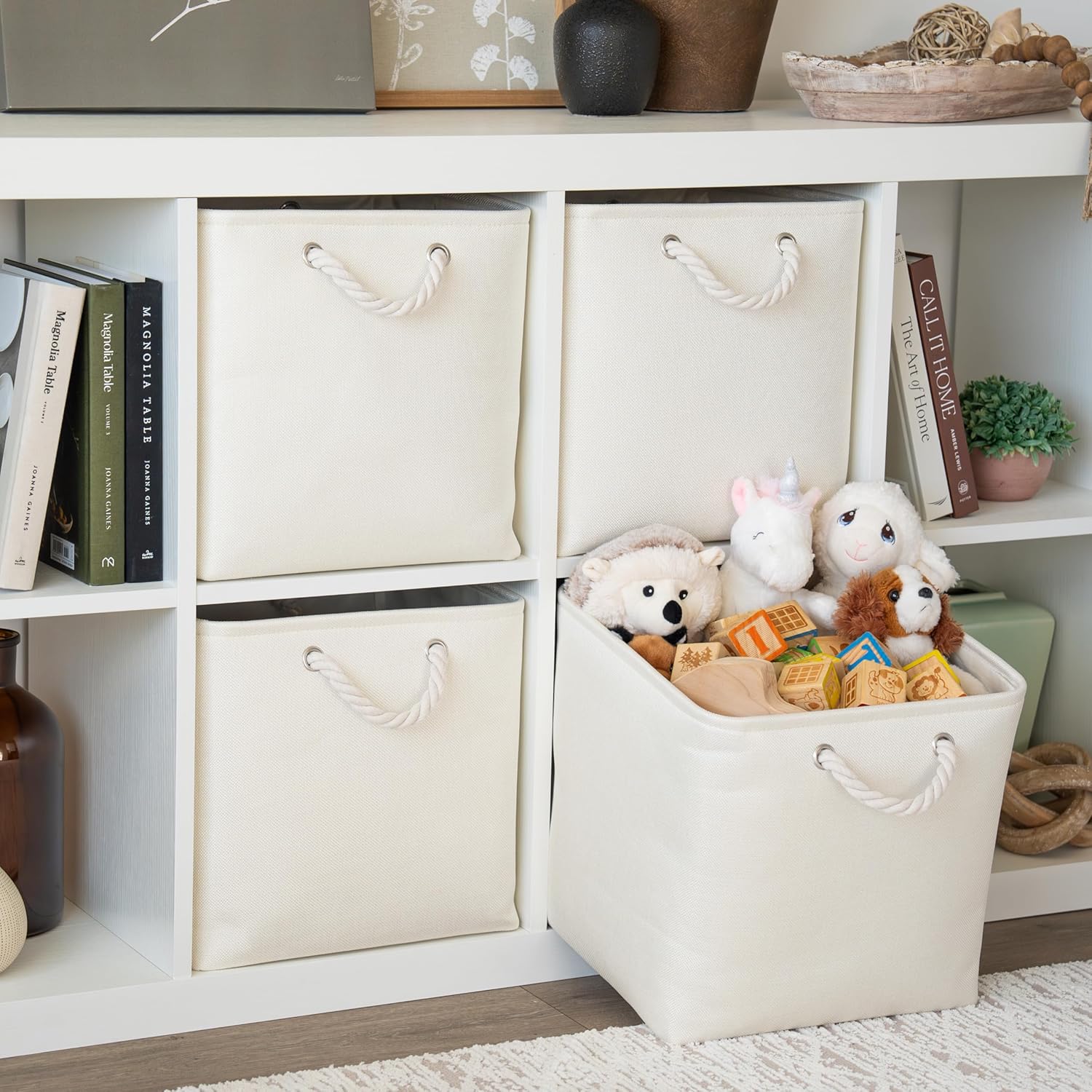 OrganiHaus 13x13 Cube Storage Bins 4 Pack, Foldable Cube Storage Organizer w/ Rope Handles, Collapsible Fabric Bins for Toys, Clothes & Closet Organization, Fabric Square Baskets - Off-White