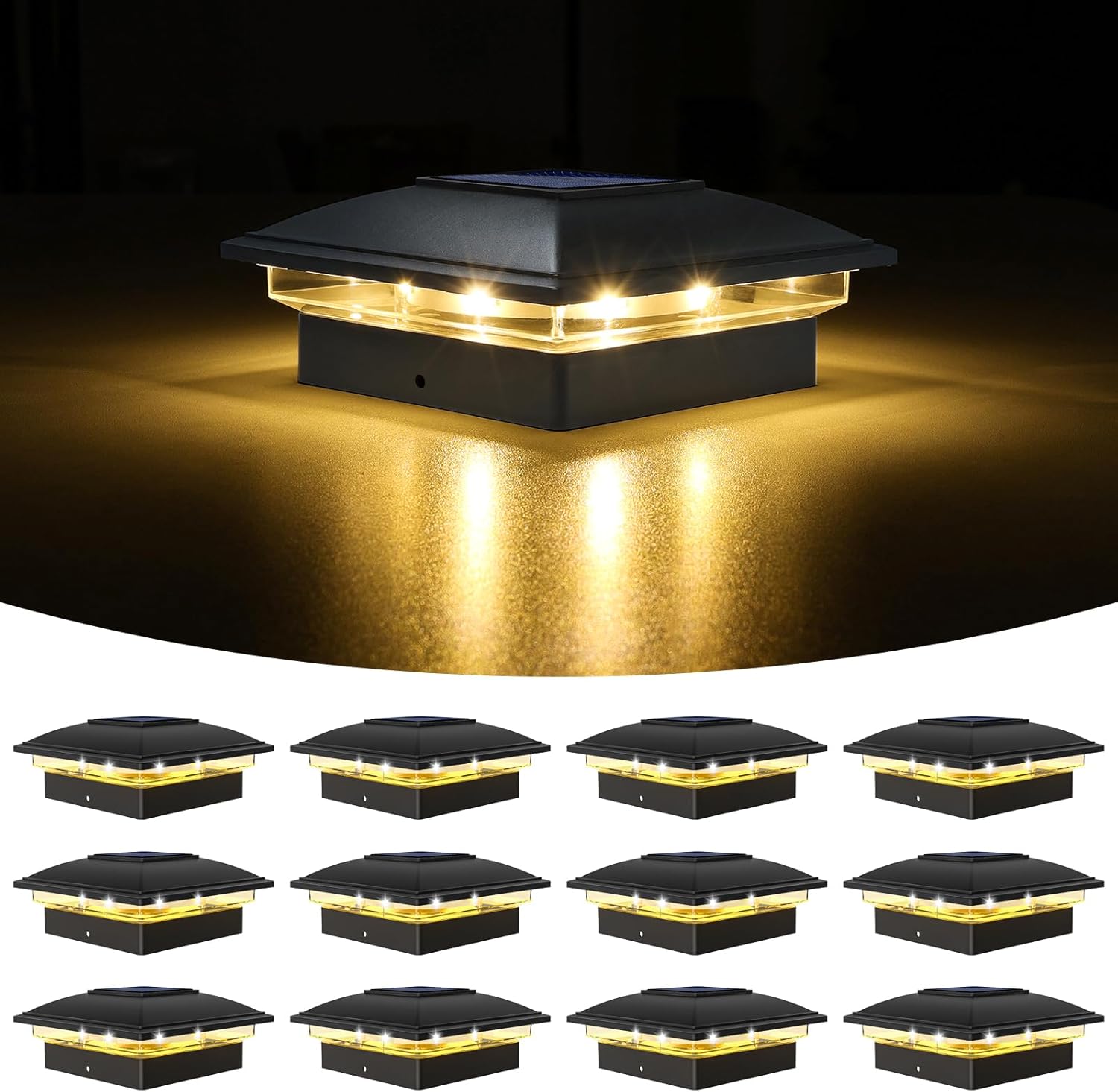 VOLISUN Solar Post Cap Light Outdoor Waterproof 12pack,Solar Fence - Post Lights for 4x4 5x5 6x6 Wooden/Vinyl Post,Black Deck Post Cap Light Solar Powered with Warm White for Garden/Patio/Porch