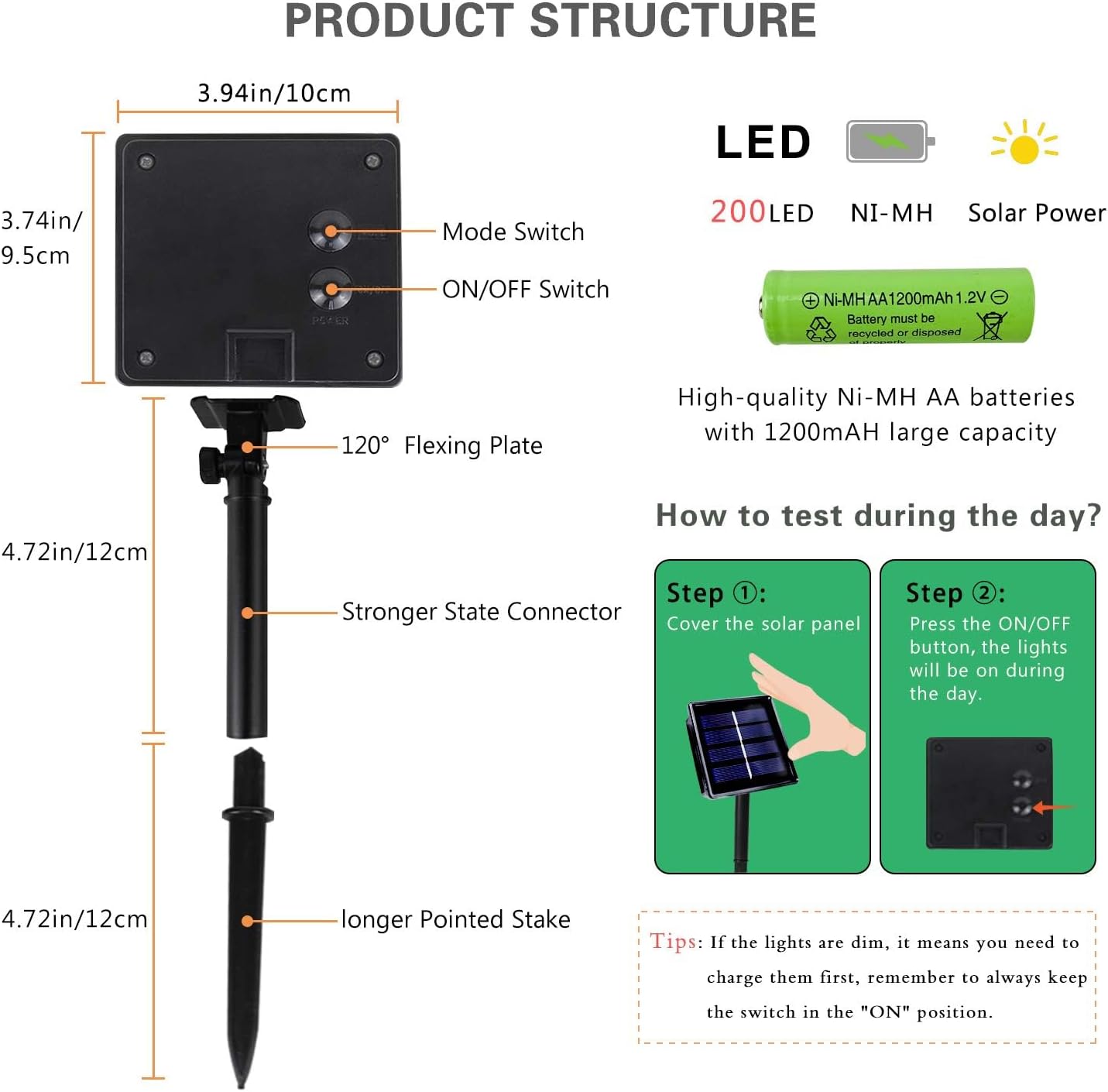 • 8 Lighting Modes, Memory Function and Auto On/Off: These solar twinkle lights have the On/Off button and Mode button. You can select 8 different modes to satisfy your diverse needs by pressing the mode button. And the built-in memory chip saves your last modes setting, so there is no need to reset it again.