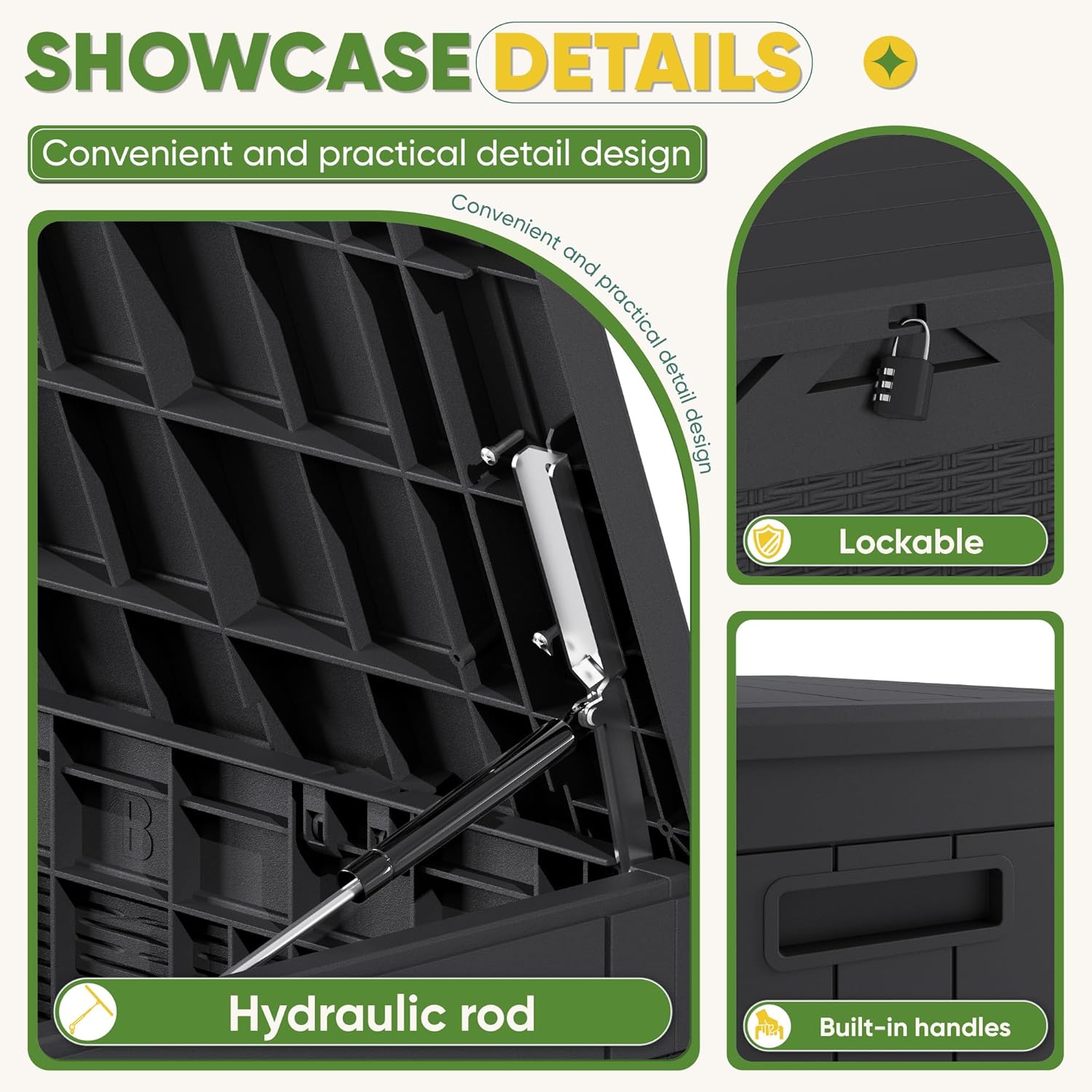 • WIDE VERSATILITY: The 100 gallon storage box can not only help you organize your patio or lawn. It can also be used as a table or bench when you need it, and the lid is equipped with a support bar inside, which can greatly enhance the stability and weight-bearing capacity of the storage box.