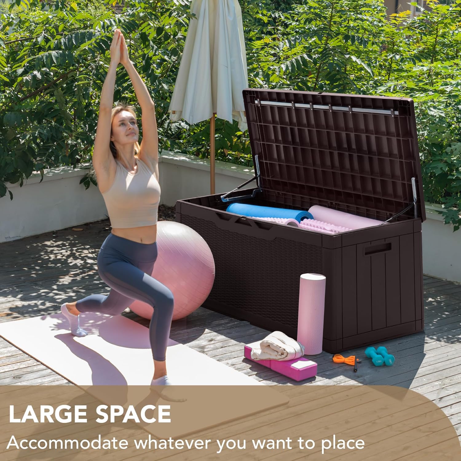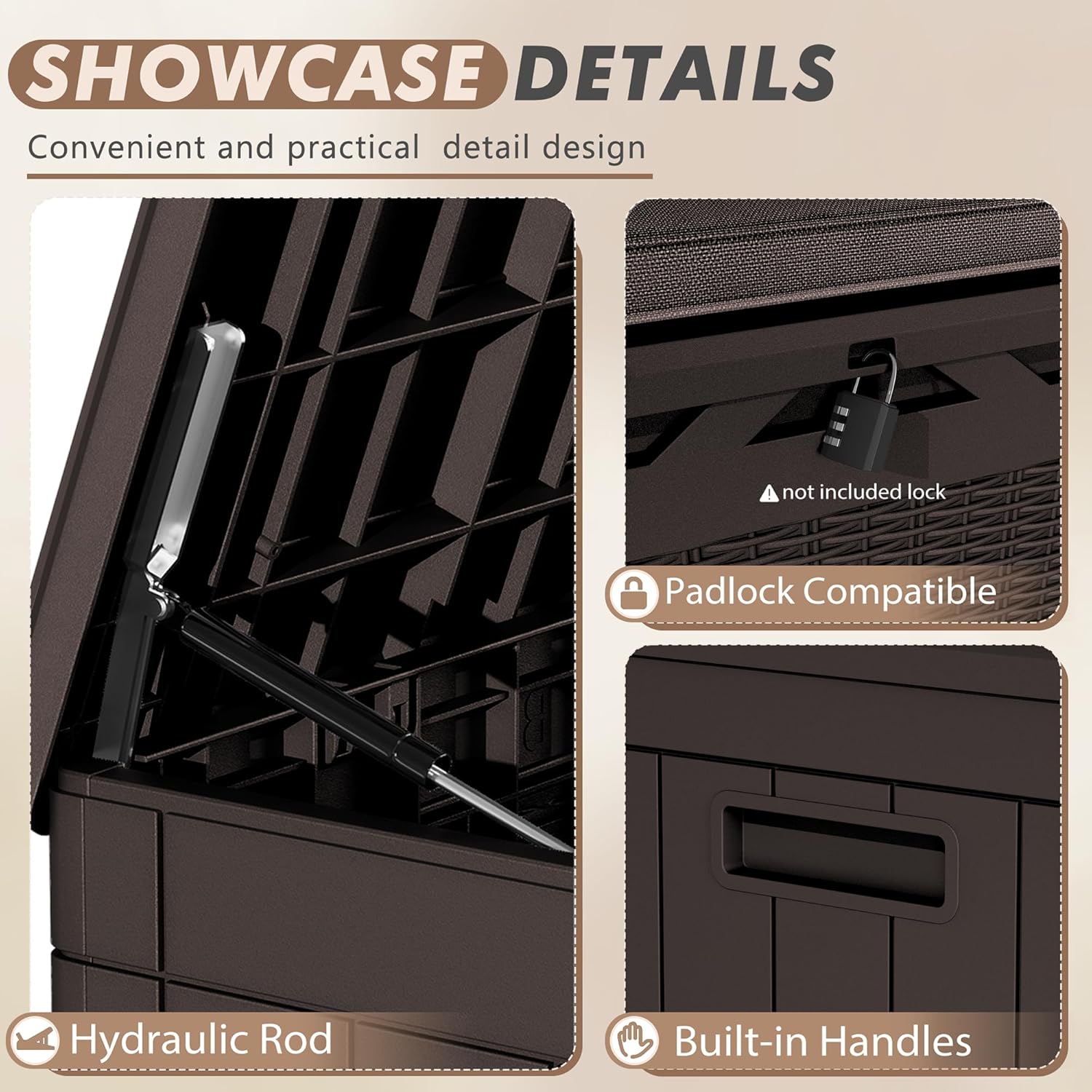 • Durable Resin Material: Deck box is made of waterproof resin, with a complementing rattan pattern design, effectively preventing fading and rusting, while also maintaining a fresh appearance even with all-weather use