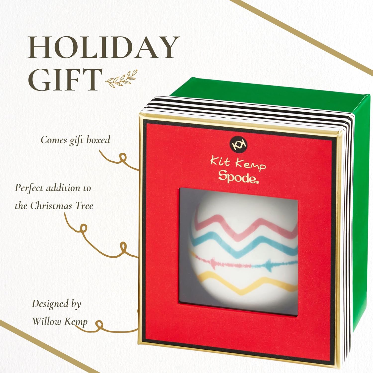 • Charming Whimsy: The Kit Kemp Rik Rak ornament features a vibrant zig-zak illustration that adds a unique and playful touch to your Christmas tree ornaments, perfect for infusing your holiday decor with fun and festive spirit.