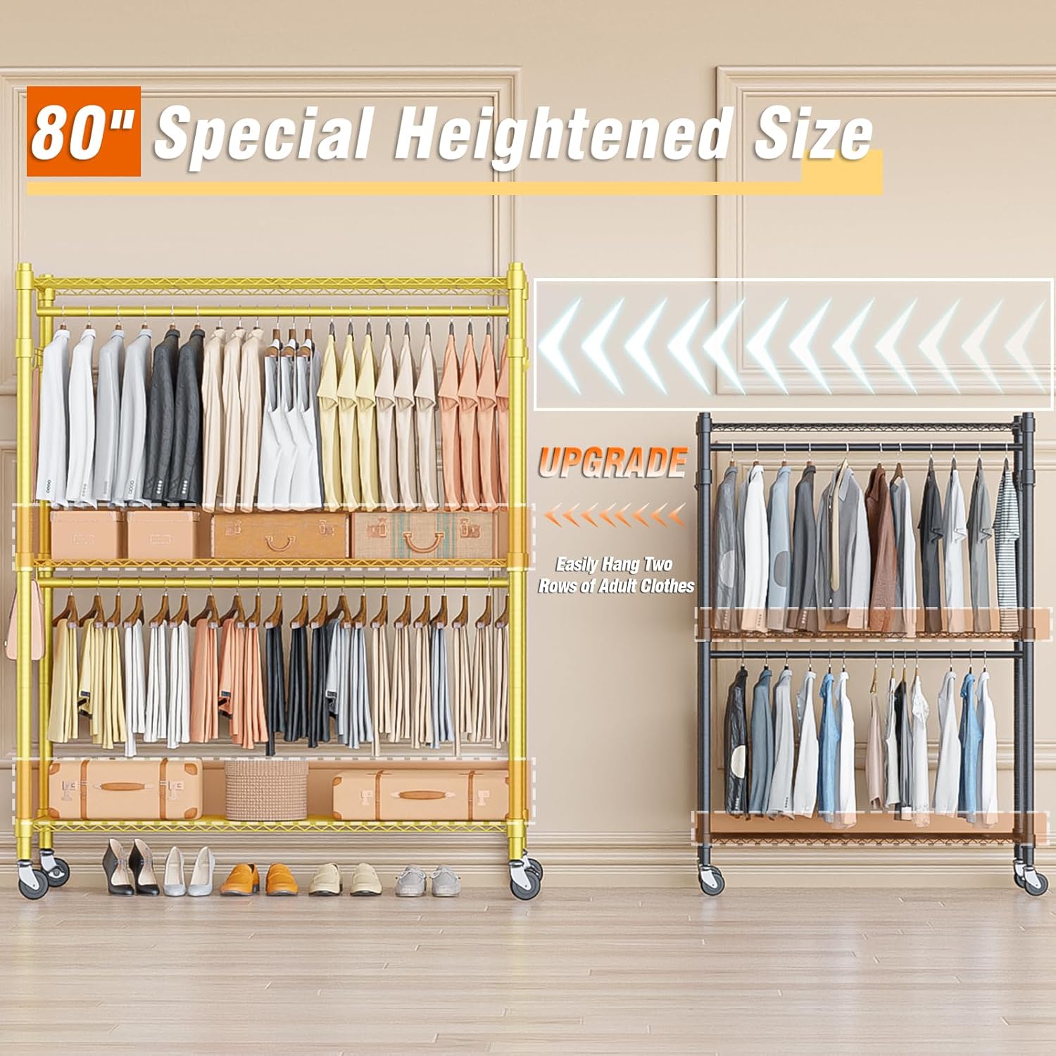 Homdox Gold Heavy Duty Clothes Rack with Wheels, 3-Tier Rolling Metal Garment Organizer with Double Hanging Rods & Hooks, Freestanding Portable Closet, 17.72" D x 47.24" W x 80.71" H