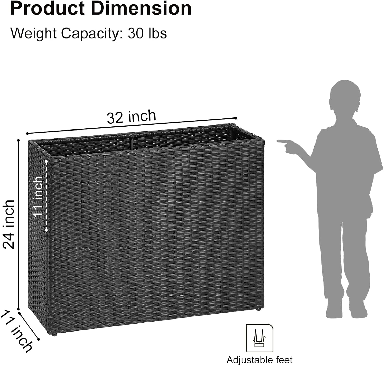 • Product Details - Dimensions (LxWxH) Plant pot: 32 x 11 x 24 inch Material: PE rattan, Powder-coated Steel, Plastic , Adjustable Feet
