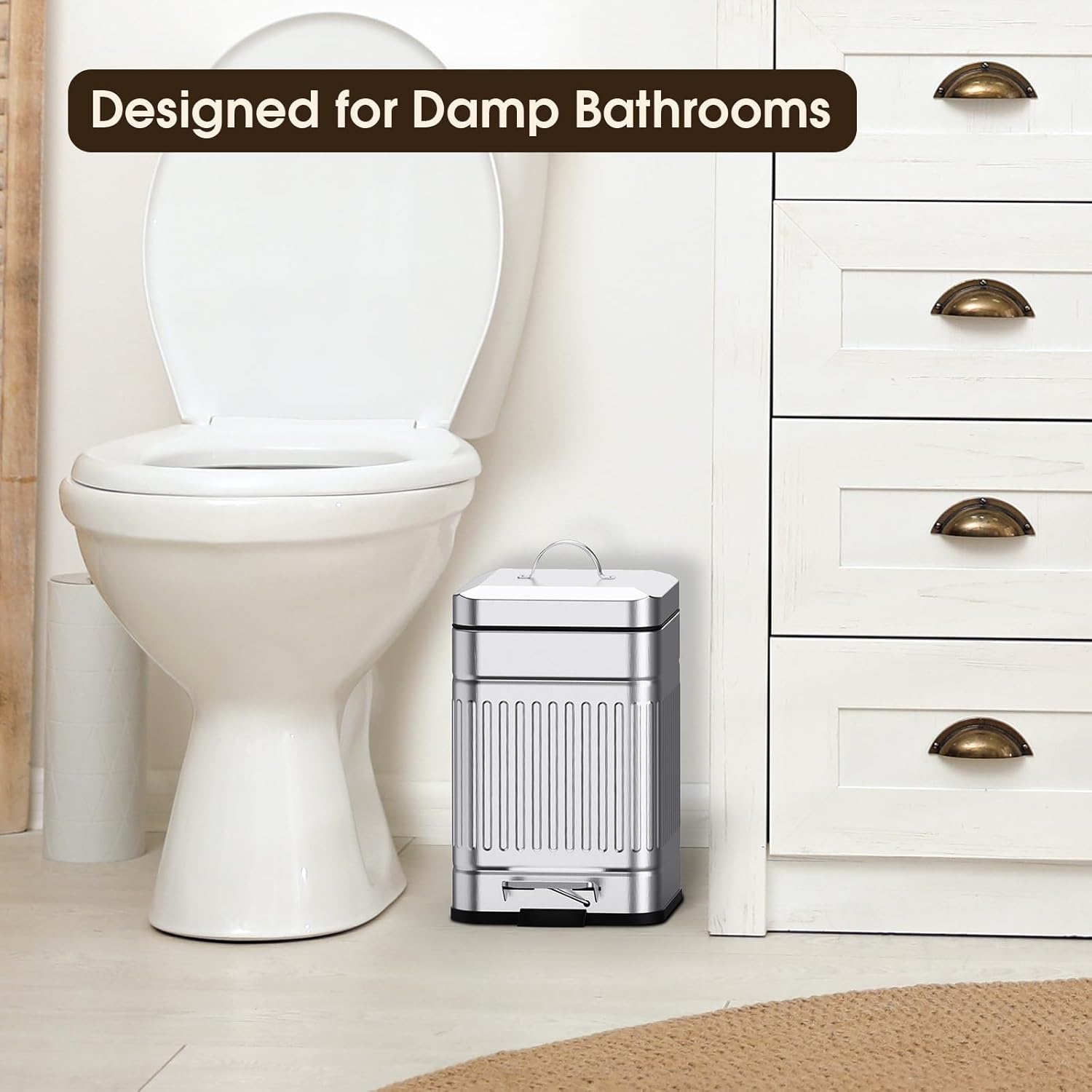 • Retro Design: This Rectangular Metal trash can is the perfect vintage garbage can specially designed with an Embossed body and matte finish; Looks sophisticated and retro whether used in farmhouses, bathrooms, bedrooms, offices, toilets, dorms, etc