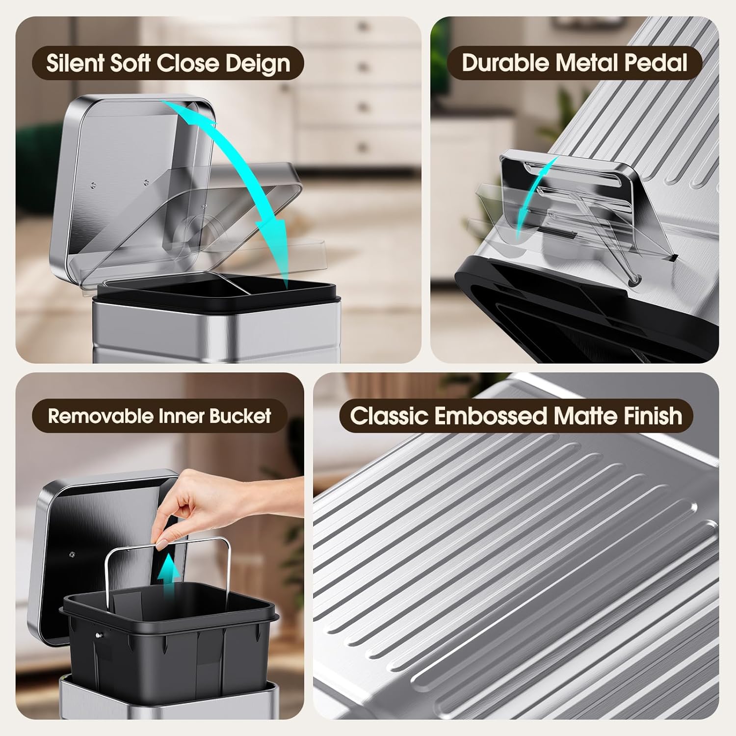 • Silent Soft Close: The step trash can has a damper arrangement that retards the close of allows the lid to close quietly and safely by itself every time, don’t worry about disturbing the rest of your family