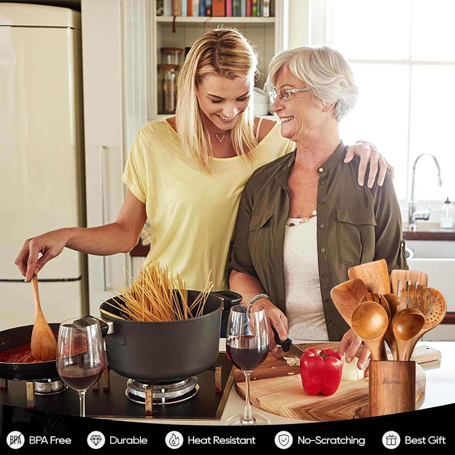 • 10-Piece Kitchen Utensils Set: Our complete wood kitchen utensil set includes all the essential cooking tools, such as a flat spatula, fried spatula, slotted spatula, kitchen utensil holder, strainer spoon, Soup Ladle,spaghetti spoon,salad fork, salad spoon, and mixing spoon. This comprehensive set covers all your kitchen needs from stirring to cooking