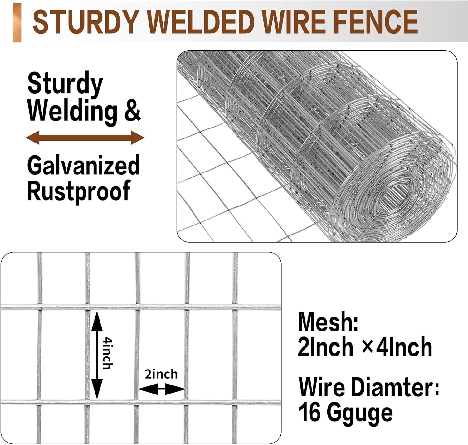 Tongmo 2 ft x 100 ft Galvanized Welded Wire Fence, 16GA Garden Chicken Wire Fence Roll, Mesh Size 2" x 4"Hardware Cloth, Ideal for Yard Protection and Poultry Netting
