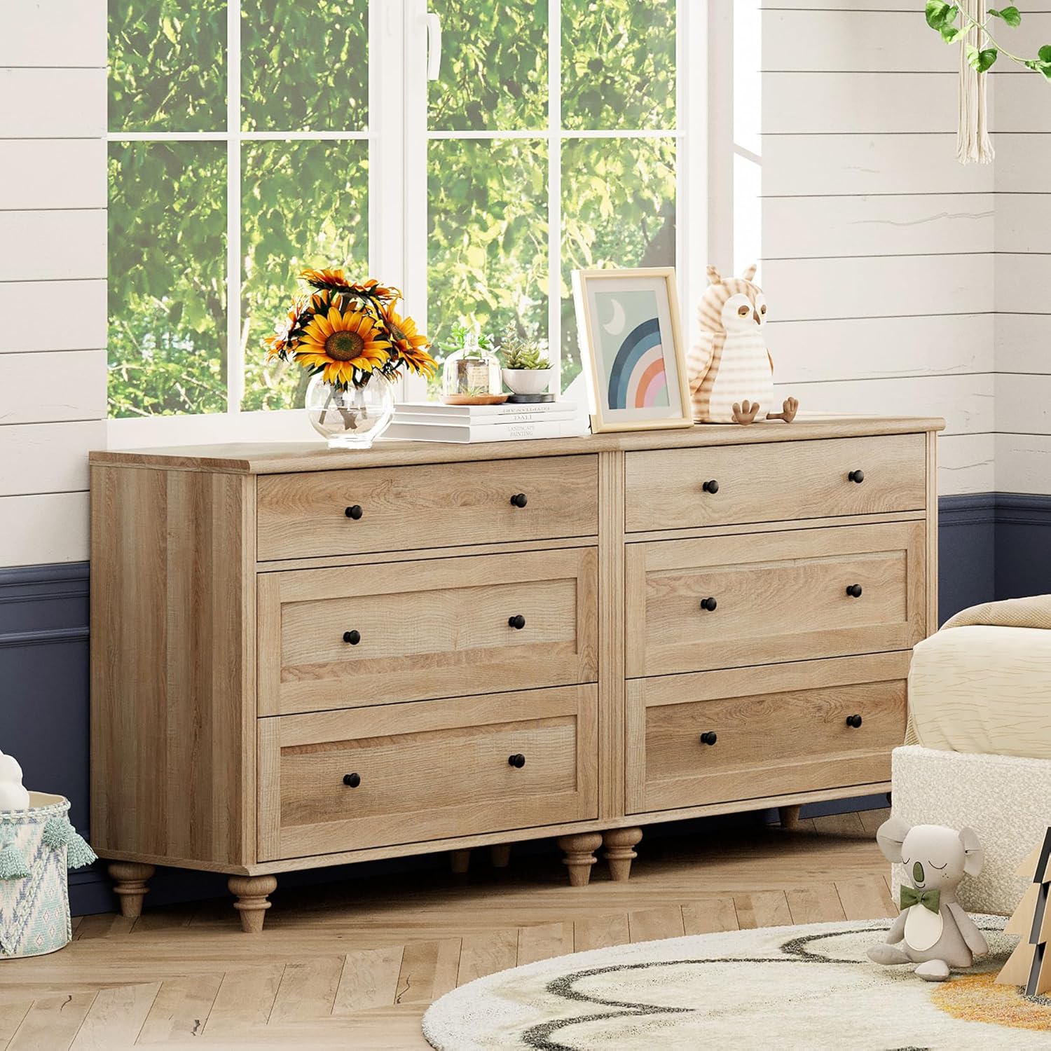 • 【Ample Storage Space】Featuring 6 deep drawers, the oak dresser is great to organize your clothes, blankets, etc. The bedroom dresser maximizes the vertical storage space while keeping your daily essentials and display decorations in order.Overall Dimension: 67.8''L×15.7''W×30.9''H