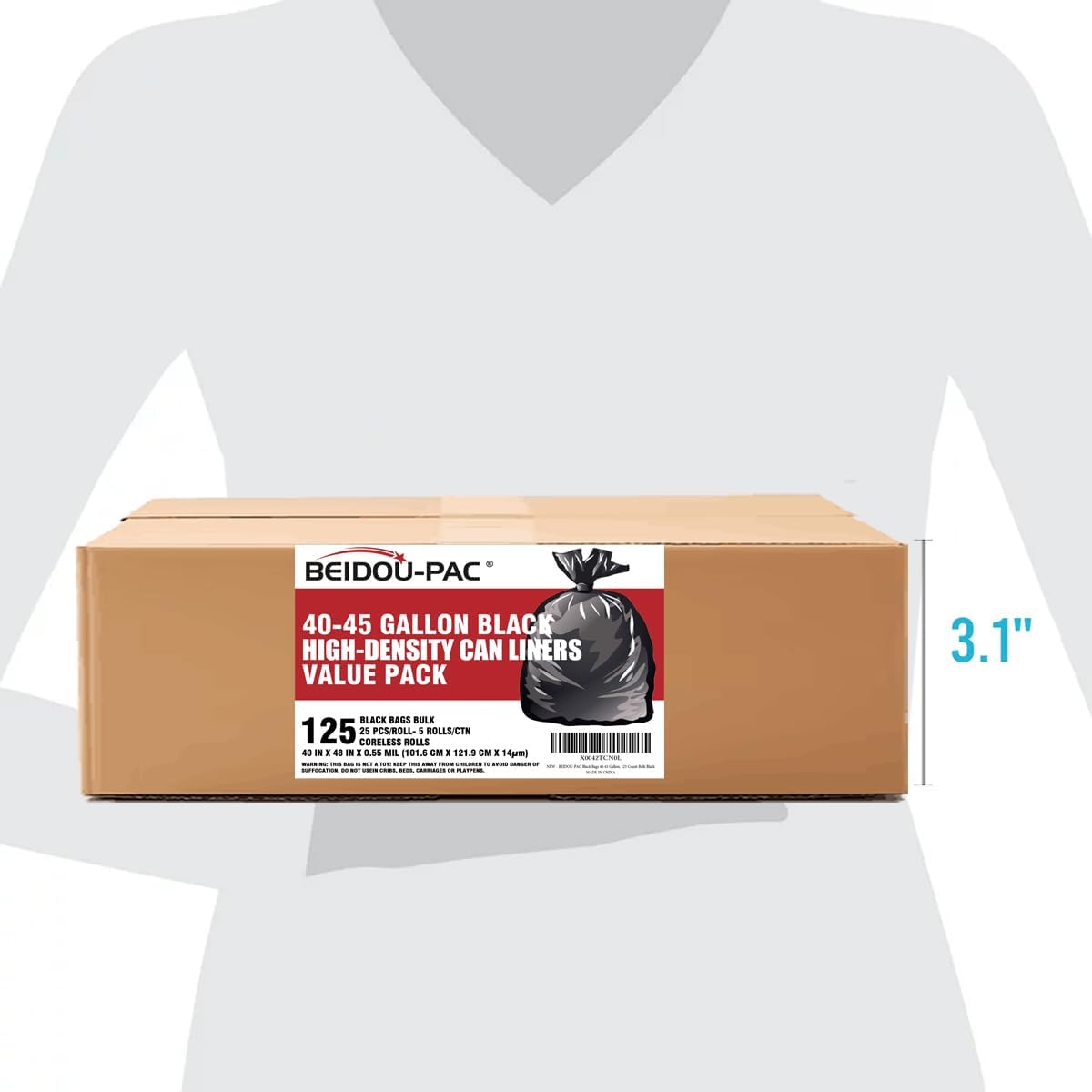 • 1, Product information: BEIDOU-PAC 40-45 gallon large balck plastic recycling trash bags, Size: 40" x 48"x 14 mic, Total 125 bags bulk (25 PCS/ROLL, 5 CORELESS ROLLS/CTN), Perfect for 40-45 Gal Capacity Office, commercial, industrial, or residential waste.