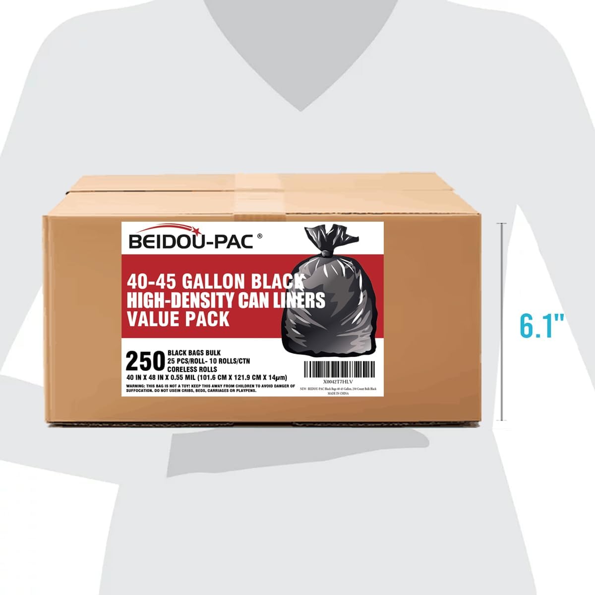 • 1, Product information: BEIDOU-PAC 40-45 gallon large balck plastic recycling trash bags, Size: 40" x 48"x 14 mic, Total 250 bags bulk (25 PCS/ROLL, 10 CORELESS ROLLS/CTN), Perfect for 40-45 Gal Capacity Office, commercial, industrial, or residential waste.